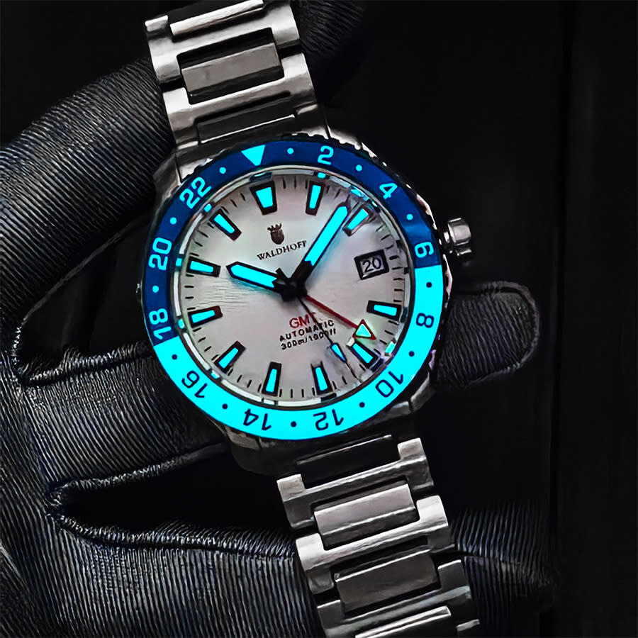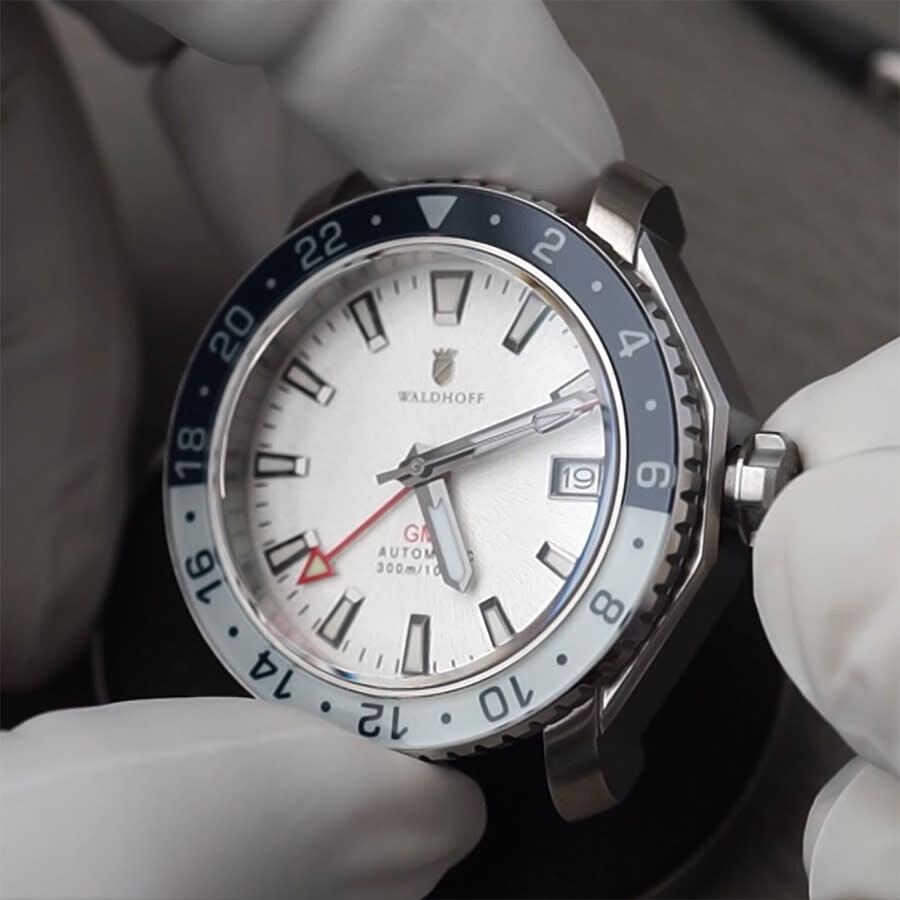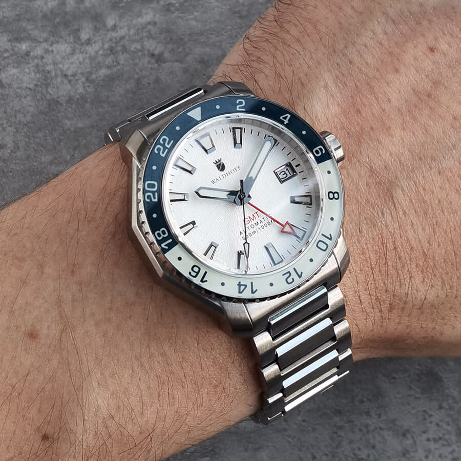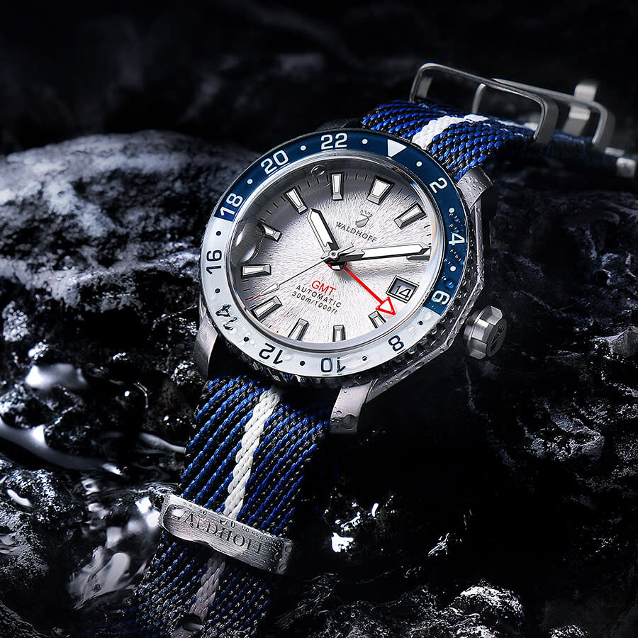 Silver-tone stainless steel case and bracelet. Bi-directional rotating blue sapphire bezel. Silver-tone dial with silver-tone hands and index hour markers. Minute markers around the outer rim. Dial Type: Analog. Luminescent hands and markers. Date display at the 3 o'clock position. NH 34 GMT automatic movement. Scratch resistant sapphire crystal. Screw down crown. Solid case back. Unique case shape, case size: 41 mm, case thickness: 13.5 mm. Band width: 20 mm. Fold over clasp with a safety release. Water resistant at 300 meters / 1000 feet. Functions: date, hour, minute, second. Atlas Gmt Series. Dive watch style. Waldhoff Atlas GMT Automatic Silver Dial Men's Watch MW-23A-3S.