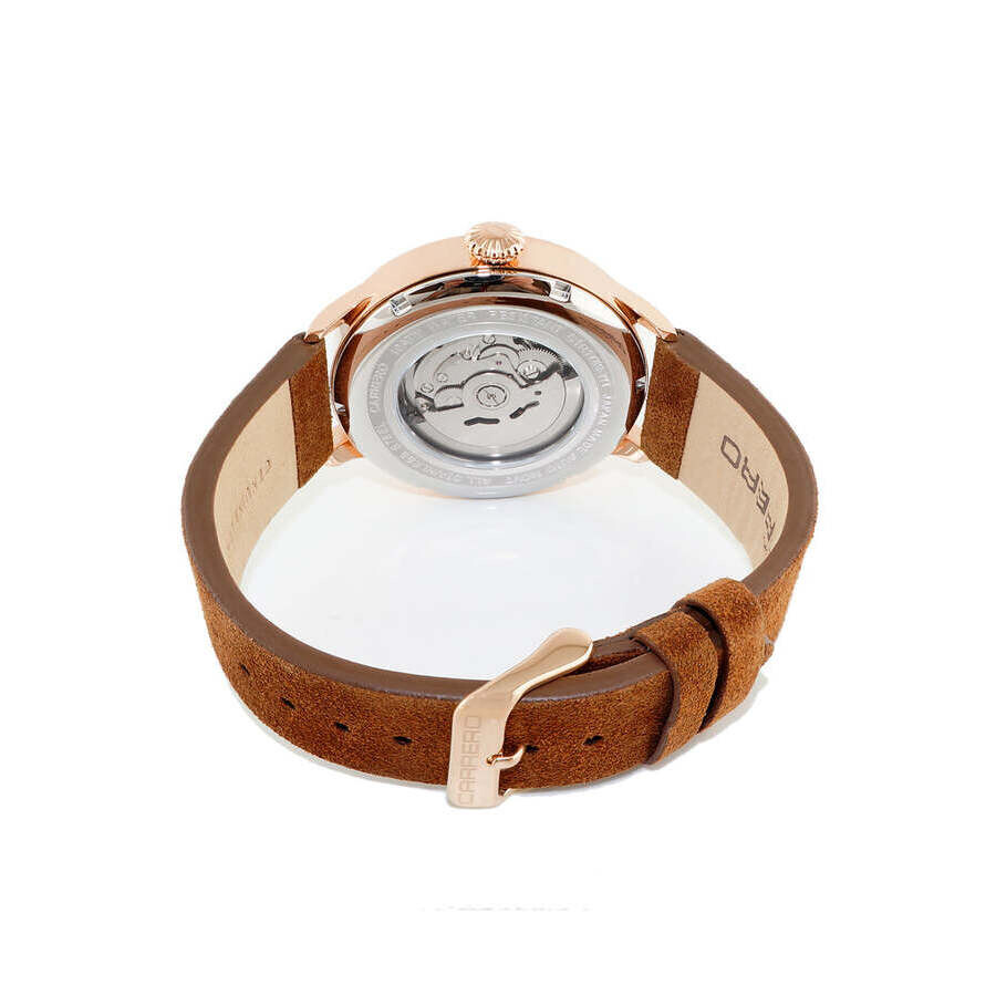 TORINO CARRERO MEN'S WATCH, NH35 (24-JEWELS AUTOMATIC) WITH EXHIBITION BACK, OPEN HEART BEAT CURVE WHITE DIAL, STAINLESS STEEL CASE ROSE TONE, BROWN GENUINE LEATHER BAND Rose gold-tone stainless steel case with a brown genuine leather strap. Fixed rose gold-tone stainless steel bezel. White dial with rose gold-tone hands and Roman numeral & index hour markers. Minute markers around the outer rim. Dial Type: Analog. Luminescent hands. Date display at the 3 o'clock position. TMI Caliber NH35 Automatic movement, containing 24 Jewels, bitting at 21600 vph, and has a power reserve of approximately 41 hours. Scratch resistant mineral crystal. Pull / push crown. Transparent case back. Round case shape, case size: 45 mm, case thickness: 15.25 mm. Band width: 22 mm, band length: 7.5 inches. Buckle clasp. Water resistant at 100 meters / 330 feet. Functions: date, hour, minute, second. Additional Info: open heart. Aerodrome Series. Dress watch style. Watch label: Japan Movt. Torino Carrero Aerodrome Automatic White Dial Men's Watch C1R1780-WTJ.