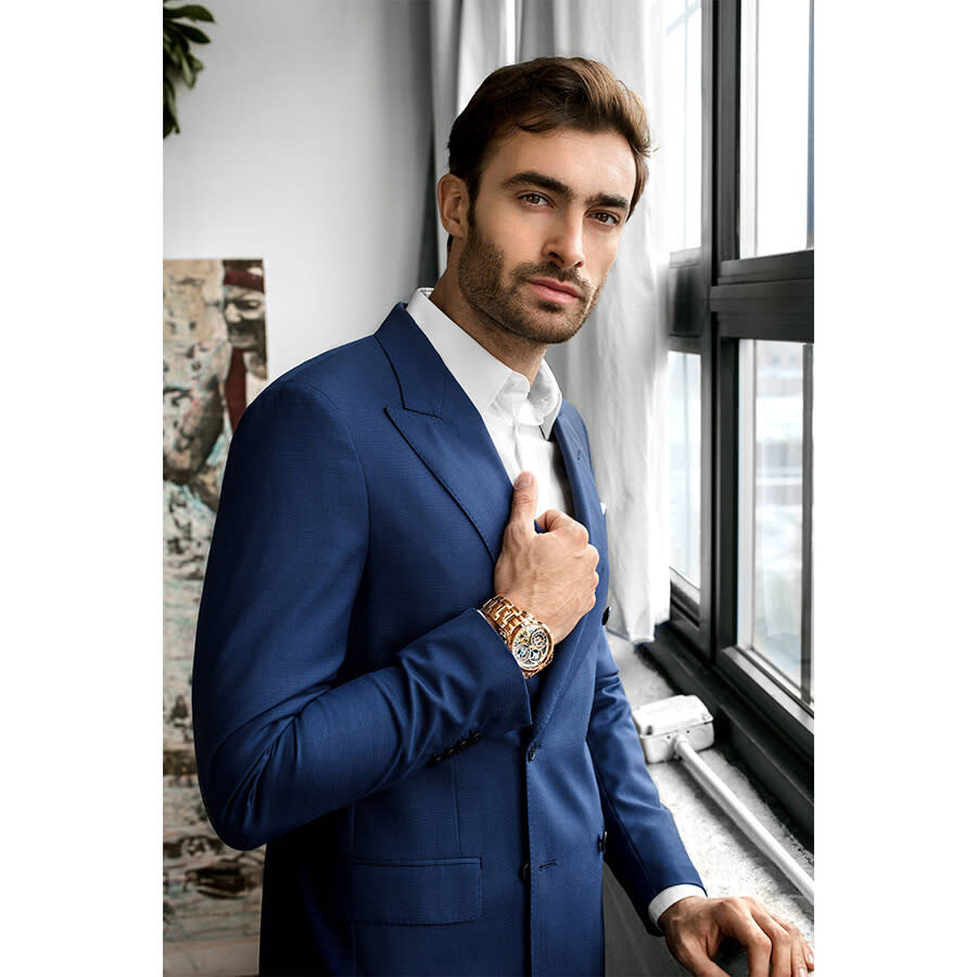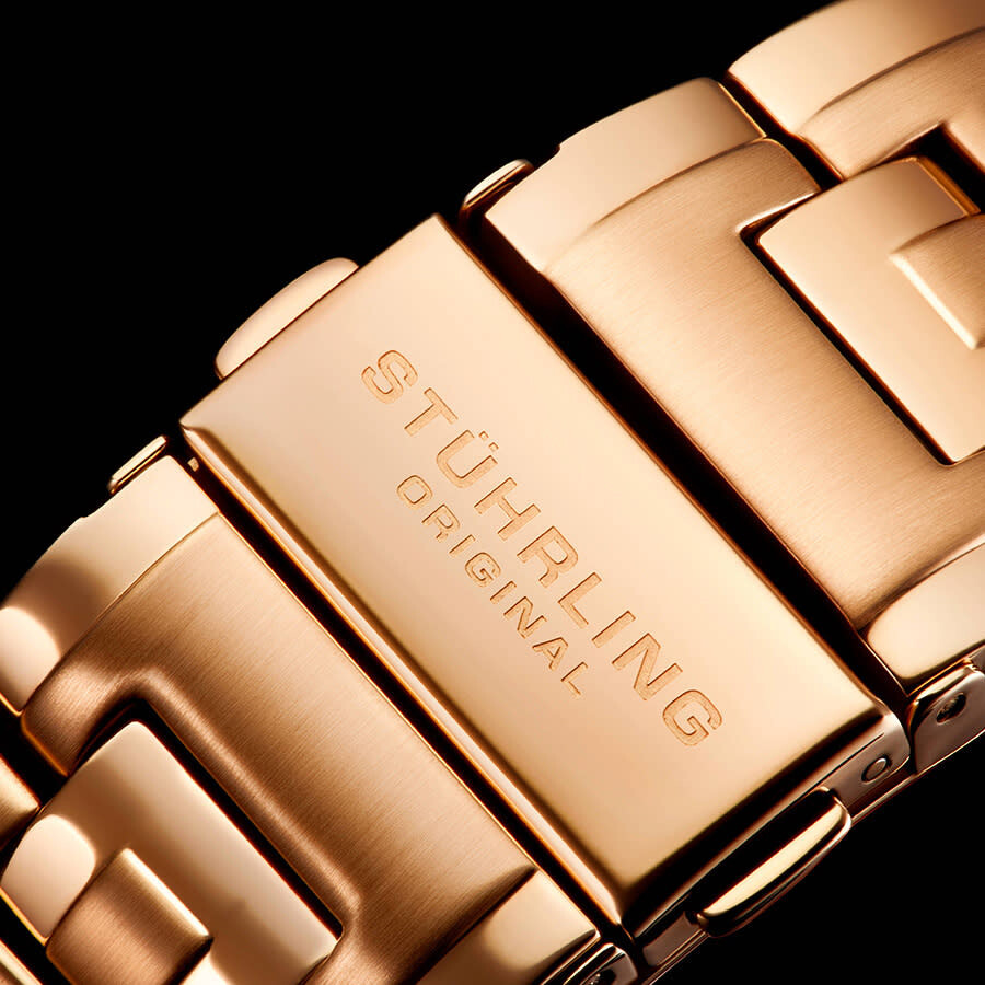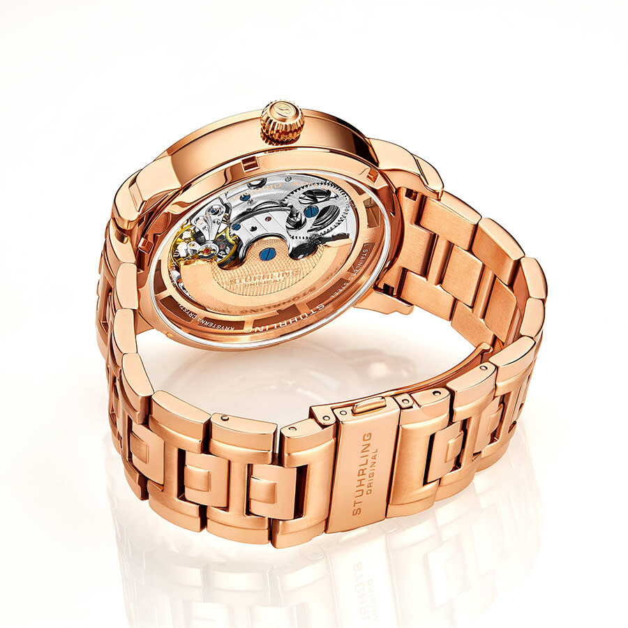 Rose gold-tone stainless steel case with a rose gold-tone stainless steel bracelet. Fixed rose gold-tone stainless steel bezel. Rose gold-tone skeleton dial with rose gold-tone dauphine-style shape hands and index hour markers. Dial Type: Analog. Two - am/pm indicator, dual time subdials. Automatic movement. Scratch resistant krysterna crystal. Pull / push crown. Transparent case back. Round case shape, case size: 47 mm, case thickness: 12.5 mm. Band length: 9.25 inches. Deployment with push button release clasp. Water resistant at 50 meters / 165 feet. Functions: hour, minute, am/pm indicator, dual time. Dress watch style. Stuhrling Original Legacy Automatic Men's Watch M13676.