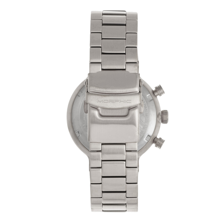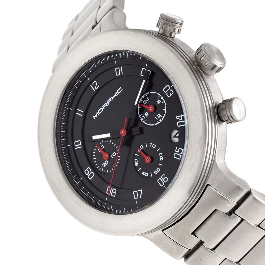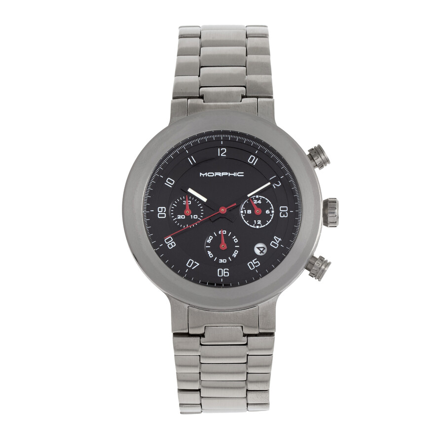 316L stainless steel case with a 316L stainless steel bracelet. Fixed 316L stainless steel bezel. Black dial with luminous black hands and Arabic numeral hour markers. Minute markers around the outer rim. Dial Type: Analog. Luminescent hands. Date display between the 4 and 5 o'clock positions. Chronograph - three sub-dials displaying: 60 second, 30 minute and 24 hour. Quartz movement. Scratch resistant mineral crystal. Pull / push crown. Solid case back. Round case shape. Case size: 43 mm. Case thickness: 13 mm. Band width: 22 mm. Fold over clasp with a push button release. Water resistant at 100 meters / 330 feet. Functions: chronograph, GMT, date, hour, minute, second. M78 Series Series. Sport watch style. Watch label: Japan Movt. Item Variations: MPH7802. Morphic M78 Series Chronograph Quartz Black Dial Men's Watch 7802.