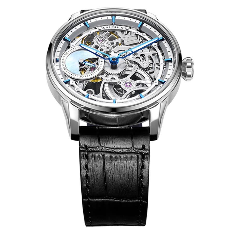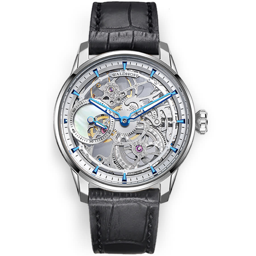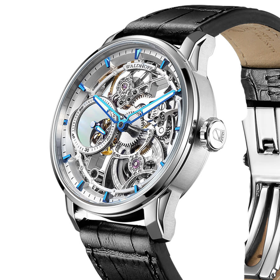 Silver-tone stainless steel case with a black calfskin band. Fixed silver-tone stainless steel bezel. Silver-tone dial with blue hands and index hour markers. Minute markers around the outer rim. Dial Type: Analog. Caliber 96A0 Hand Wind movement, containing 17 Jewels, bitting at 21600 vph, and has a power reserve of approximately 36 hours. Scratch resistant sapphire crystal. Pull / push crown. Transparent case back. Round case shape, case size: 43.5 mm, case thickness: 11 mm. Band width: 21 mm. Deployment with push button release clasp. Water resistant at 30 meters / 100 feet. Functions: hour, minute, second. Paragon Pearl Silver Series. Luxury watch style. Waldhoff Paragon Pearl Silver Hand Wind Silver Dial Men's Watch MW-12 AM.