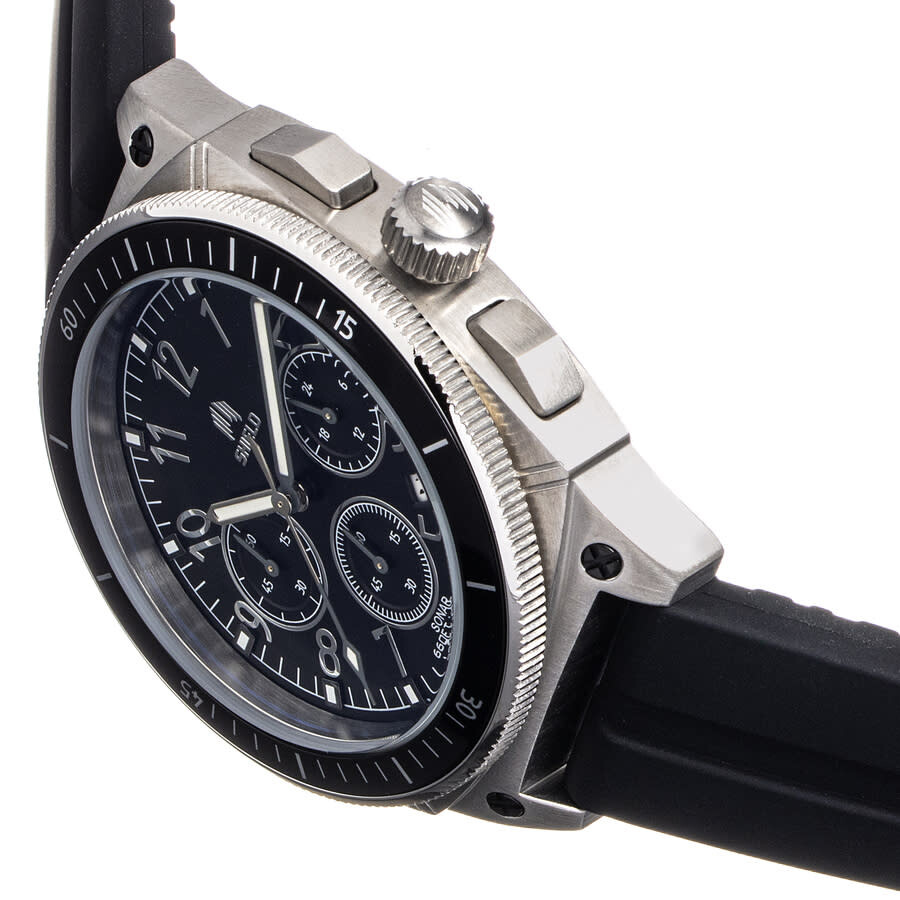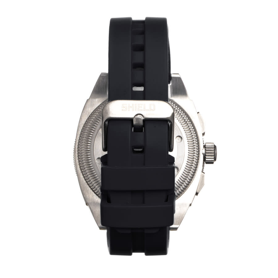 Band Color: Black Rubber; Band Width: 17mm near case; 19mm near clasp/buckle; Bezel Color: Silver; Case: Silver + Circle-Shaped; Case Finish: Brushed + Stainless Steel; Case Thickness: 14mm; Case Width: 43mm; 47mm with Crown; Clasp / Buckle: Strap Buckle; Dial: Black + Analog; Hand Color: Silver; Movement: Japanese + Quartz; Time Zones: Single; Water Resistance: 20 ATM.