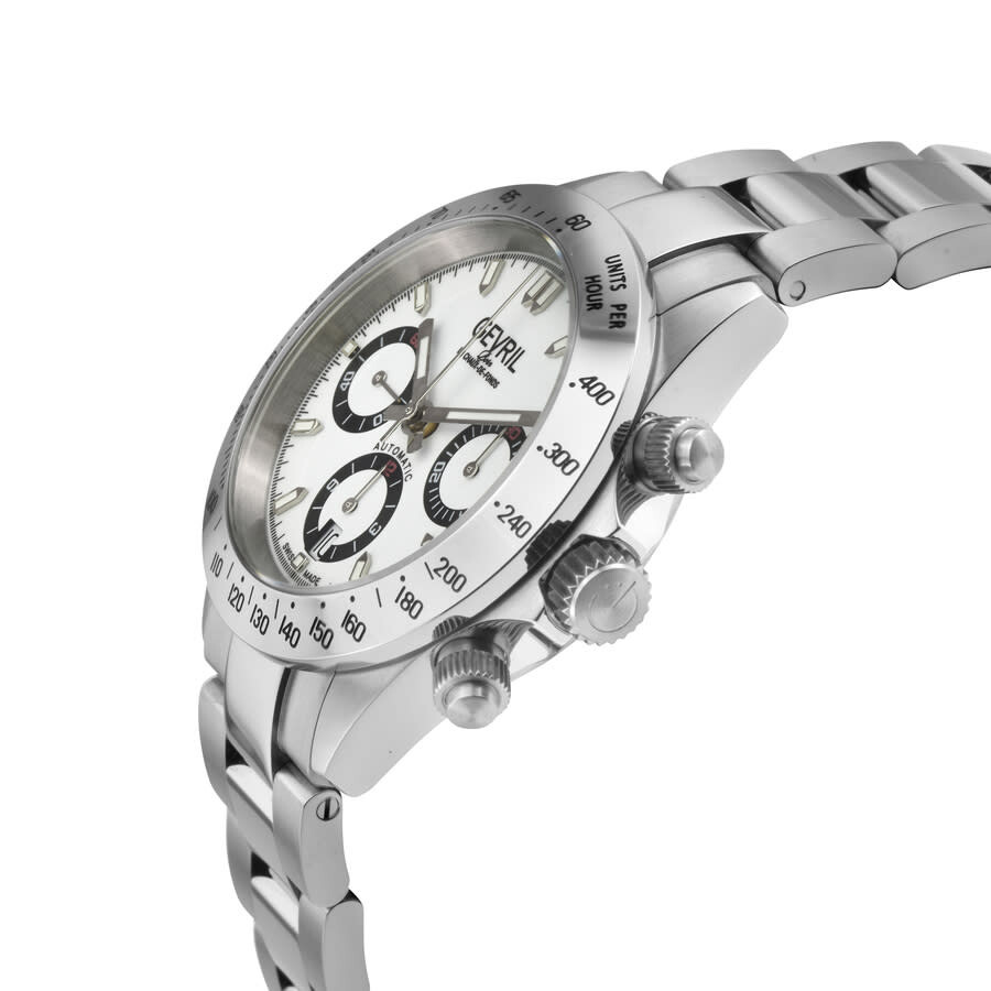 Silver-tone stainless steel case and bracelet. Fixed silver-tone stainless steel bezel. White dial with silver-tone hands and index hour markers. Minute markers around the outer rim. Dial Type: Analog. Date display at the 6 o'clock position. Chronograph - three sub-dials displaying: 60 second, 30 minute and 12 hour. ETA-Valjoux Caliber 7753 Automatic movement, based upon ETA 7750, containing 27 Jewels, bitting at 28800 vph, and has a power reserve of approximately 44 hours. Scratch resistant sapphire crystal. Screw down crown. Transparent case back. Round case shape, case size: 40 mm, case thickness: 15.5 mm. Band width: 19 mm, band length: 8.5 inches. Deployment with push button release clasp. Water resistant at 200 meters / 660 feet. Functions: chronograph, date, hour, minute, second. Additional Info: chronograph, eta 7753 Swiss automatic movement. New Amsterdam Series. Luxury watch style. Watch label: Swiss Made. Gevril New Amsterdam Chronograph Automatic White Dial Men's Watch 44606B.