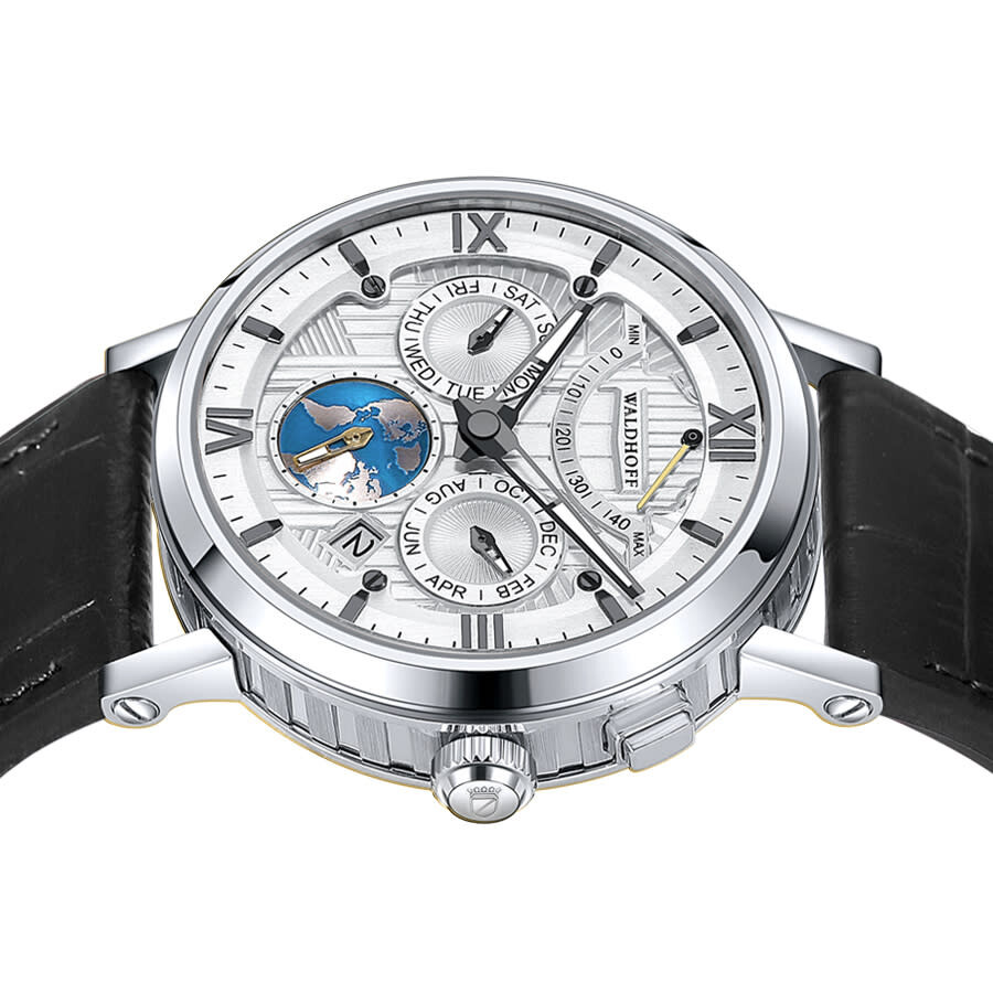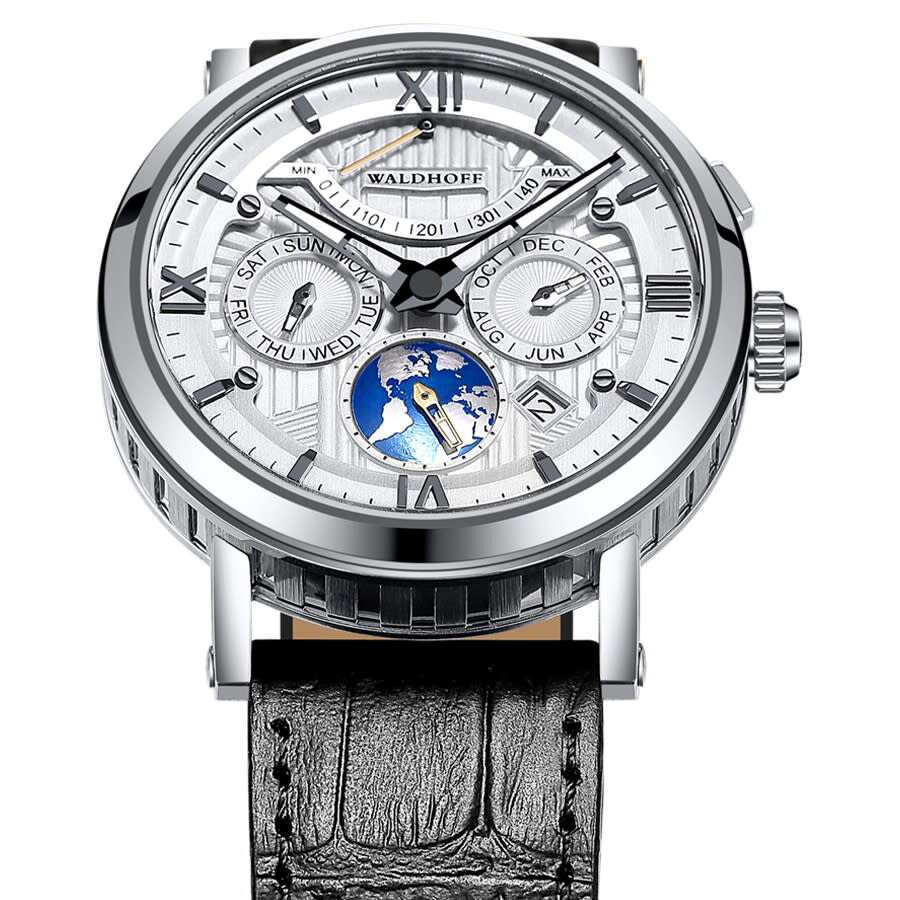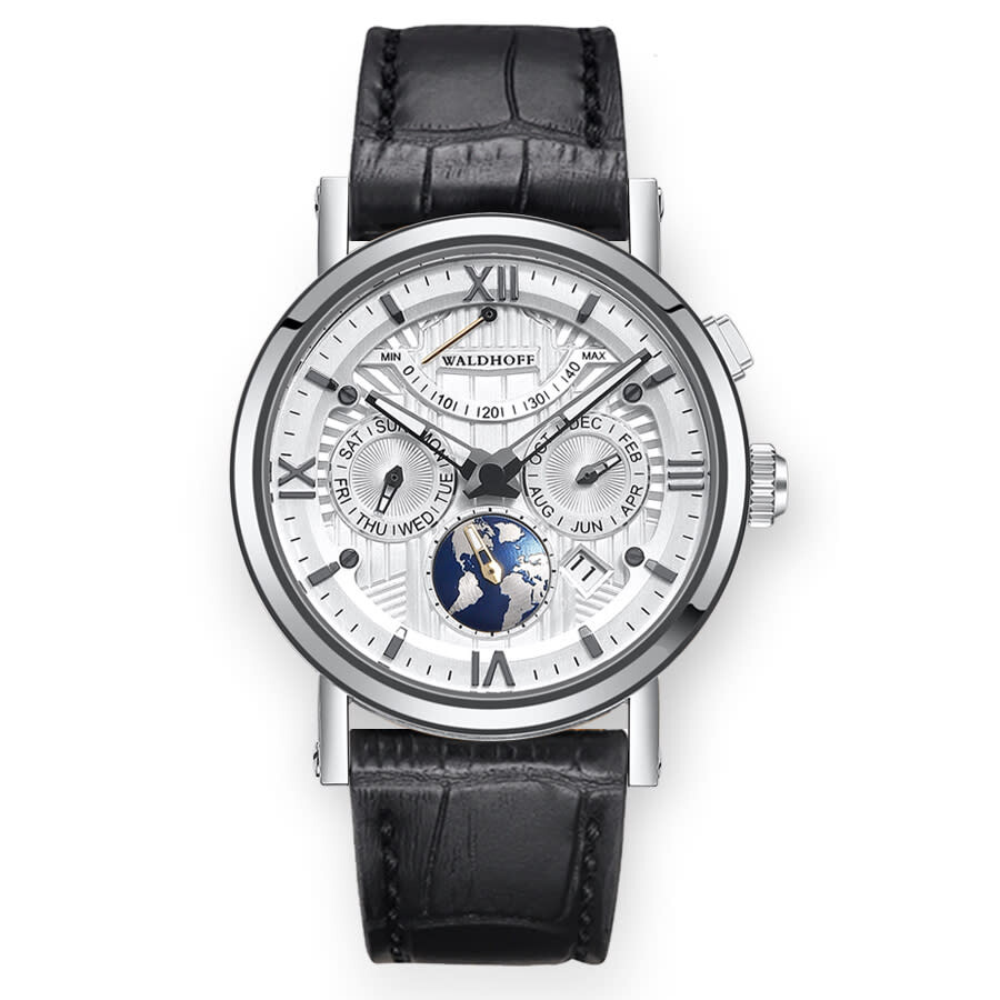 Silver-tone stainless steel case with a black calfskin band. Fixed silver-tone stainless steel bezel. Silver-tone dial with black hands and Roman numeral & index hour markers. Minute markers around the outer rim. Dial Type: Analog. Luminescent hands. Day / date / month. 24 hour, power reserve subdials. Miyota caliber 9100 Automatic movement, containing 26 Jewels, bitting at 28800 vph, and has a power reserve of approximately 40 hours. Scratch resistant sapphire crystal. Pull / push crown. Transparent case back. Round case shape, case size: 41 mm, case thickness: 11.4 mm. Band width: 22 mm. Buckle clasp. Water resistant at 30 meters / 100 feet. Functions: full calendar, month, date, day, GMT, second time zone, hour, minute, second, power reserve indicator. Multimatic II Series. Luxury watch style. Watch label: Japan Movt. Waldhoff Multimatic II Automatic Silver Dial Men's Watch Waldhoff Multimatic II Diamond Silver.