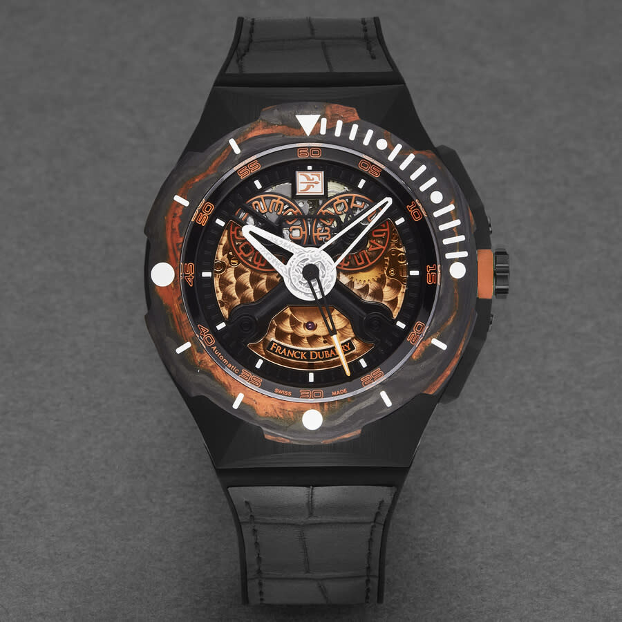 Black stainless steel case with a black rubber strap. Uni-directional rotating black stainless steel bezel. Orange dial with silver-tone hands and index hour markers. Dial Type: Analog. Automatic movement. Scratch resistant sapphire crystal. Screw down crown. Solid case back. Round case shape, case size: 43 mm, case thickness: 13.7 mm. Band width: 26 mm, band length: 8 inches. Fold over clasp. Water resistant at 300 meters / 1000 feet. Functions: hour, minute, second. Diver Series. Luxury watch style. Watch label: Swiss Made. Franck Dubarry Diver Automatic Orange Dial Men's Watch DIV-03.