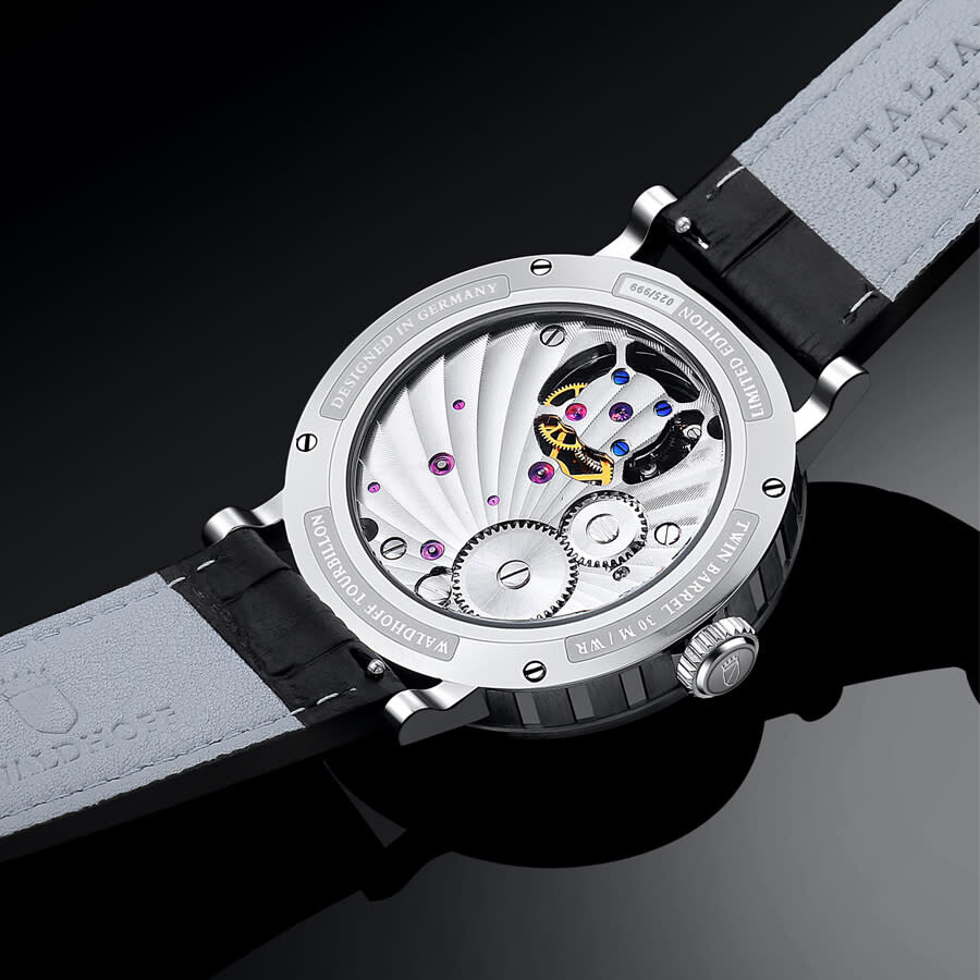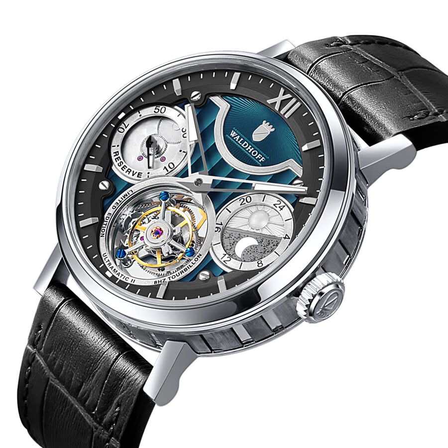 Silver-tone stainless steel case with a black calfskin band. Fixed silver-tone stainless steel bezel. Black dial with silver-tone hands and Arabic numeral & index hour markers. Minute markers around the outer rim. Dial Type: Analog. Luminescent hands. HZ 3415 Twin-Barrel tourbillon movement hand wind movement. Scratch resistant sapphire crystal. Pull / push crown. Transparent case back. Round case shape, case size: 42.5 mm, case thickness: 10 mm. Band width: 21 mm. Deployment with push button release clasp. Water resistant at 30 meters / 100 feet. Functions: hour, minute, power reserve, tourbillon. Ultramatic II Series. Luxury watch style. Waldhoff Ultramatic II Tourbillon Hand Wind Black Dial Men's Watch Ultramatic II Black Sand.
