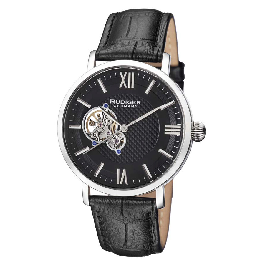 Stainless steel case with a black leather strap. Fixed stainless steel bezel. Black (open heart) dial with silver-tone hands and index hour markers. Roman numerals appear at the 6 and 12 o'clock positions. Minute markers around the outer rim. Dial Type: Analog. Automatic movement. Scratch resistant anti-reflective sapphire crystal. Pull / push crown. Transparent case back. Round case shape. Case size: 40 mm. Case thickness: 12.9 mm. Band width: 19.7 mm. Band length: 8.5 inches. Tang clasp. Water resistant at 50 meters / 165 feet. Functions: hour, minute, second. Stuttgart Series. Casual watch style. Rudiger Stuttgart Black Dial Men's Watch R3500-04-007.