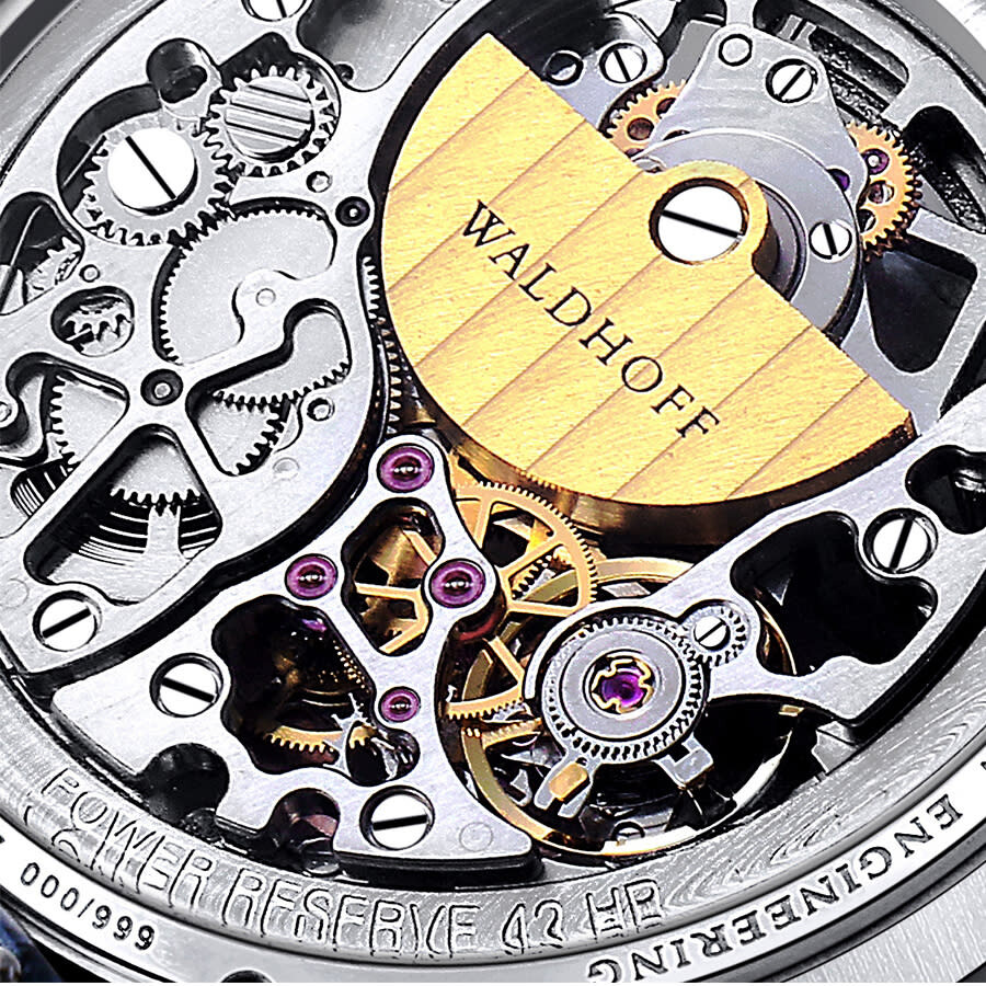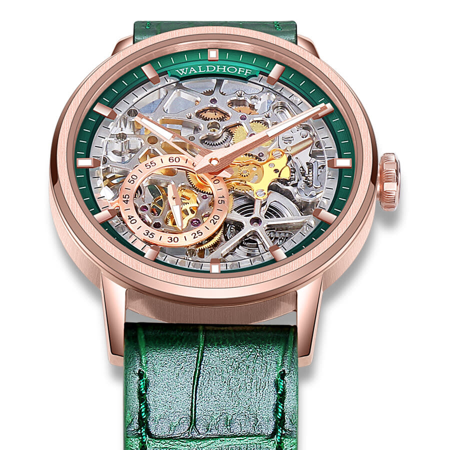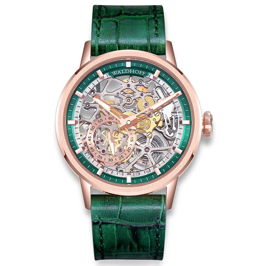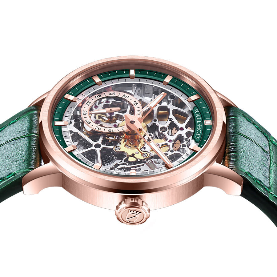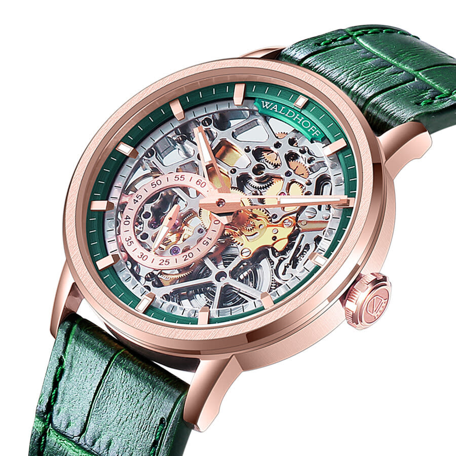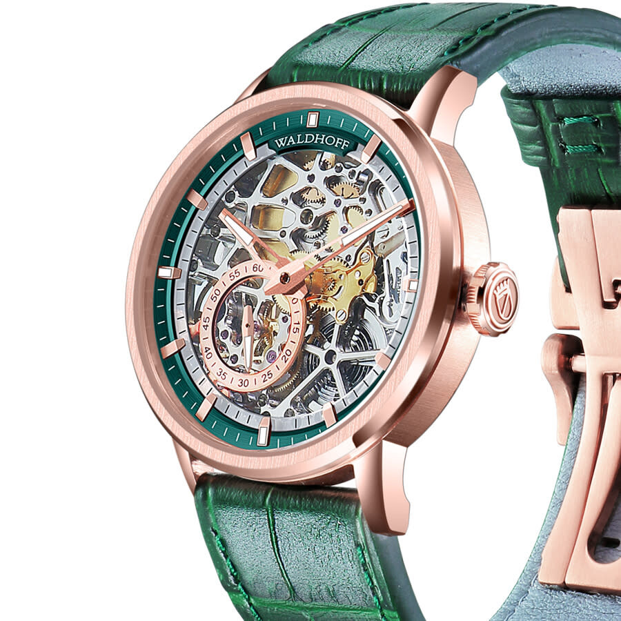 Rose gold-tone stainless steel case with a green calfskin band. Fixed rose gold-tone stainless steel bezel. Green dial with rose gold-tone hands and index hour markers. Minute markers around the outer rim. Dial Type: Analog. Luminescent hands and markers. HZ5500 Automatic Micro-Rotor automatic movement. Scratch resistant sapphire crystal. Pull / push crown. Transparent case back. Round case shape, case size: 39 mm, case thickness: 10.6 mm. Band width: 20 mm. Deployment with push button release clasp. Water resistant at 30 meters / 100 feet. Functions: hour, minute, second. Pioneer Series. Luxury watch style. Waldhoff Pioneer Automatic Green Dial Men's Watch Waldhoff Pioneer Emerald.