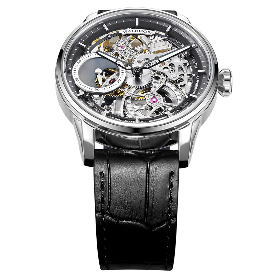 Silver-tone stainless steel case with a black calfskin band. Fixed silver-tone stainless steel bezel. Black dial with black hands and index hour markers. Minute markers around the outer rim. Dial Type: Analog. Luminescent hands. Caliber 96A0 Hand Wind movement, containing 17 Jewels, bitting at 21600 vph, and has a power reserve of approximately 36 hours. Scratch resistant sapphire crystal. Pull / push crown. Transparent case back. Round case shape, case size: 43.5 mm, case thickness: 11 mm. Band width: 22 mm. Deployment with push button release clasp. Water resistant at 30 meters / 100 feet. Functions: hour, minute, second. Paragon Pearl Obsidian Series. Luxury watch style. Waldhoff Paragon Pearl Obsidian Hand Wind Black Dial Men's Watch MW-12 BM.