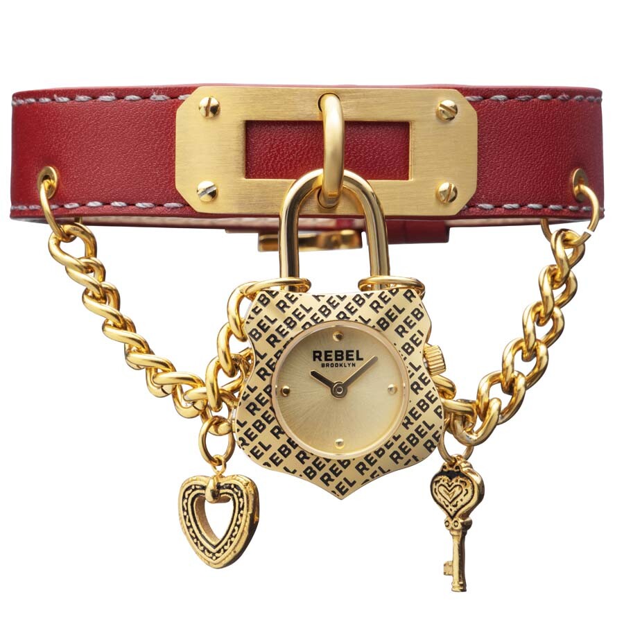 Gold-tone stainless steel case with a red leather strap. Fixed gold-tone stainless steel bezel. Gold dial with gold-tone hands and index hour markers. Dial Type: Analog. Quartz movement. Scratch resistant mineral w/ sapphire coating crystal. Push/pull crown. Solid case back. Round case shape, case size: 25 mm, case thickness: 7 mm. Band width: 16 mm, band length: 7.5 inches. Tang clasp. Water resistant at 50 meters / 165 feet. Functions: hour, minute. Casual watch style. Rebel Seagate Gold Dial Ladies Watch RB114-9051.