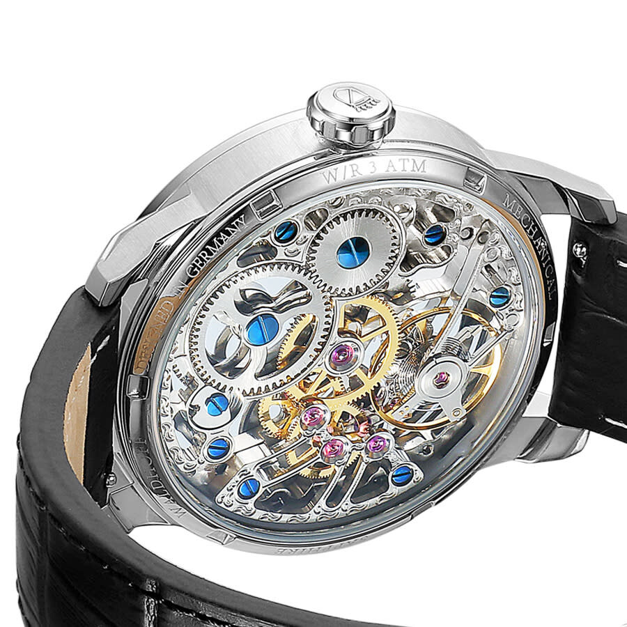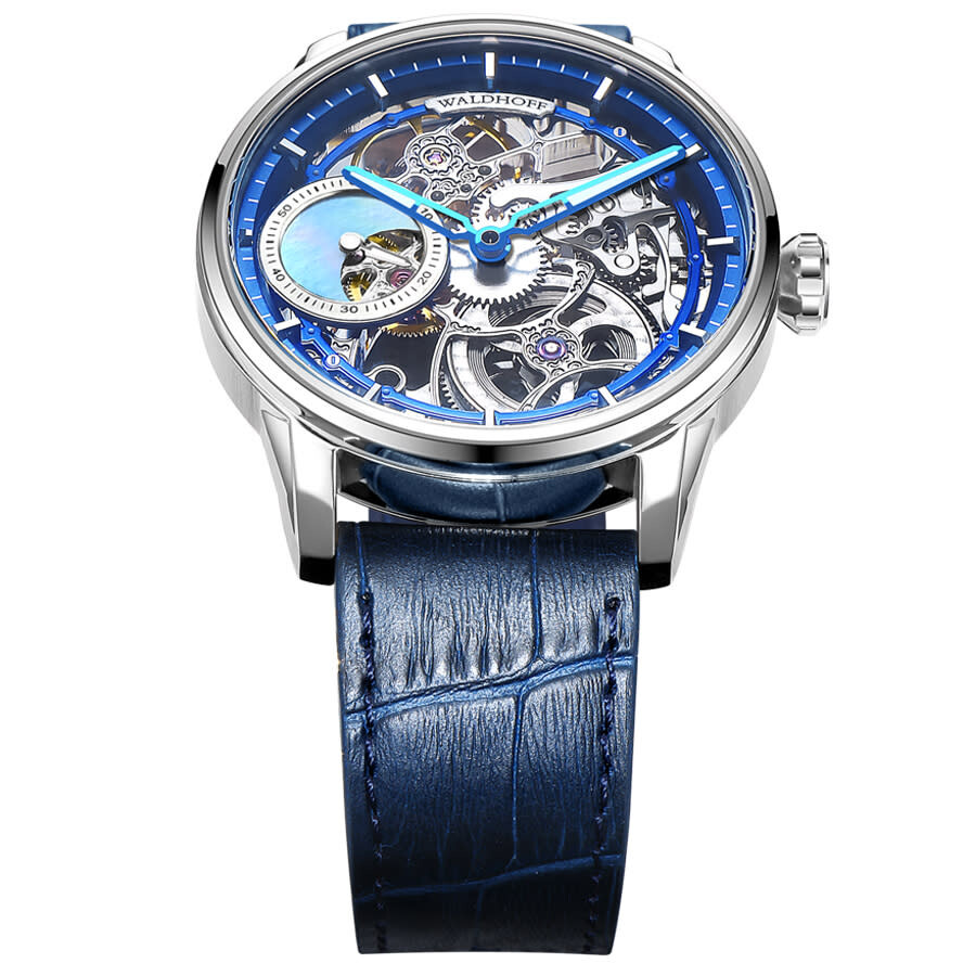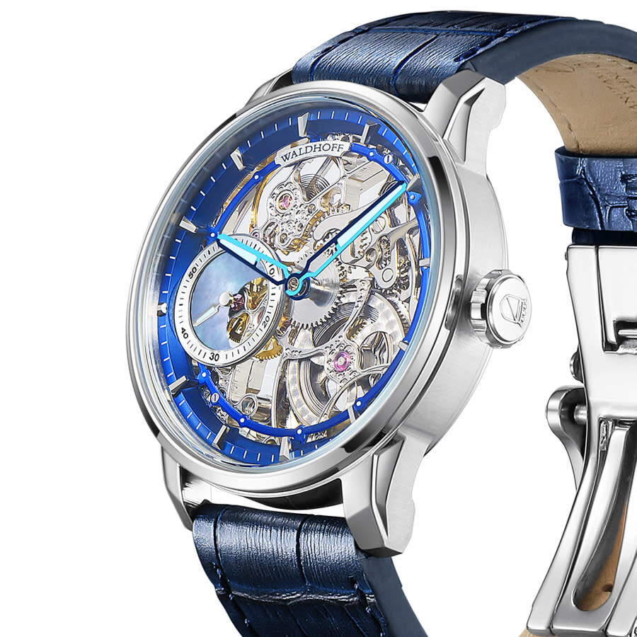 Silver-tone stainless steel case with a blue calfskin band. Fixed silver-tone stainless steel bezel. Blue dial with blue hands and index hour markers. Minute markers around the outer rim. Dial Type: Analog. Luminescent hands. 60 second subdials. Caliber 96A0 hand wind movement. Scratch resistant sapphire crystal. Pull / push crown. Transparent case back. Round case shape, case size: 43.5 mm, case thickness: 11 mm. Band width: 22 mm. Deployment with push button release clasp. Water resistant at 30 meters / 100 feet. Functions: hour, minute, second. Paragon Pearl Royal Blue Series. Luxury watch style. Waldhoff Paragon Pearl Royal Blue Hand Wind Blue Dial Men's Watch MW-12 CM.