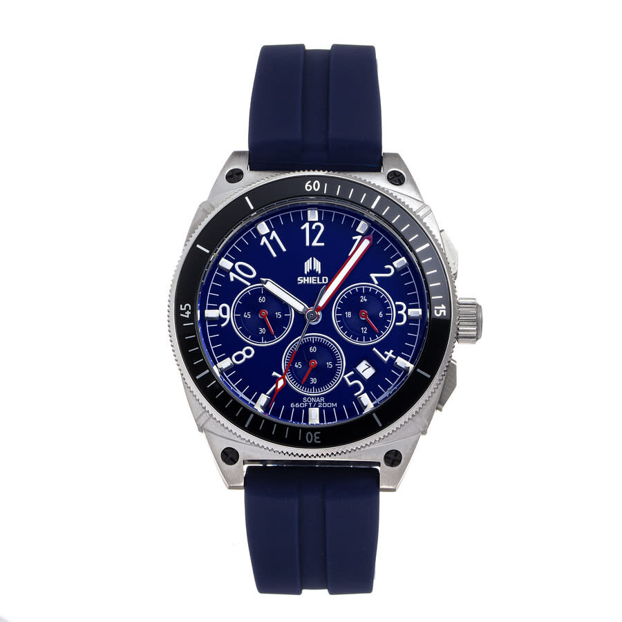 Band Color: Dark Blue Rubber; Band Width: 17mm near case; 19mm near clasp/buckle; Bezel Color: Silver; Case: Silver + Circle-Shaped; Case Finish: Brushed + Stainless Steel; Case Thickness: 14mm; Case Width: 43mm; 47mm with Crown; Clasp / Buckle: Strap Buckle; Dial: Blue + Analog; Hand Color: Silver & Red; Movement: Japanese + Quartz; Time Zones: Single; Water Resistance: 20 ATM.