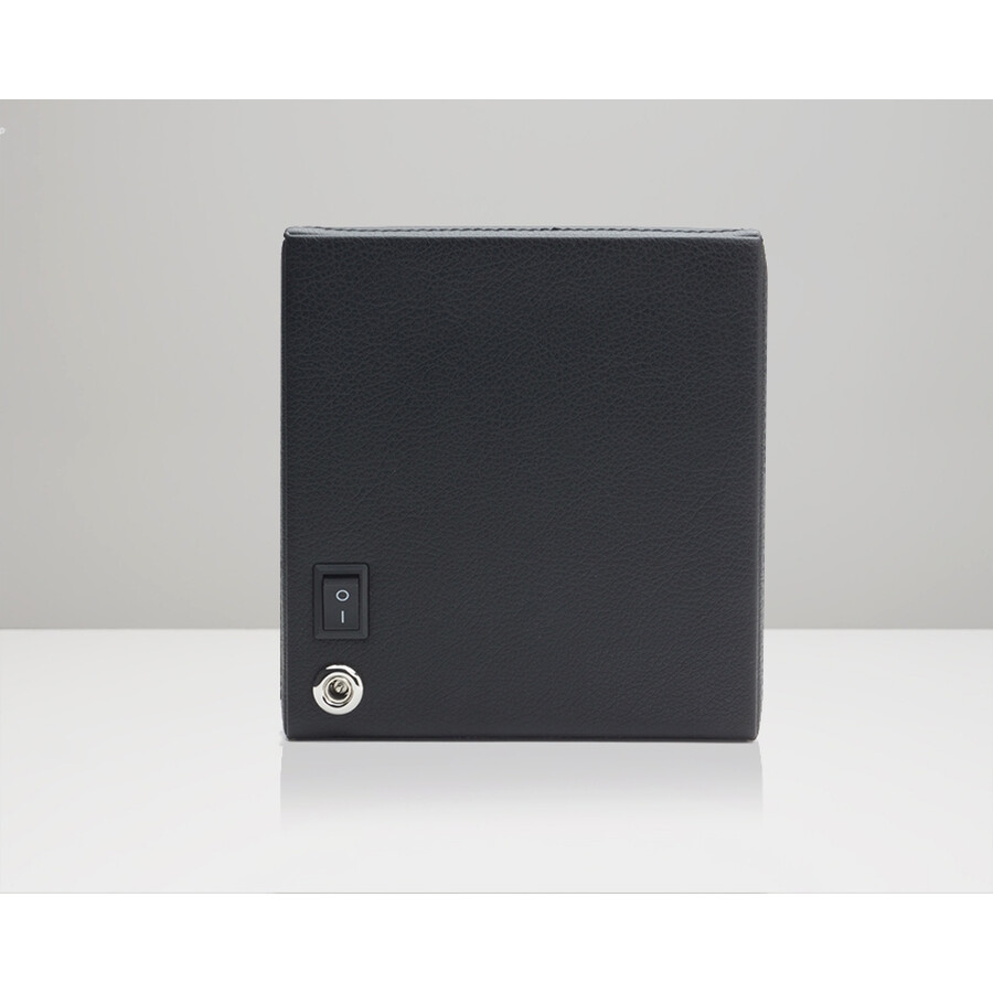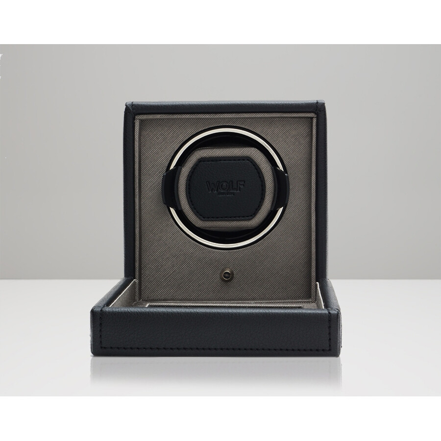 A meticulously engineered watch winder with a sharp design, the Cub includes a black pebble finish, glass cover, grey grosgrain faceplate, chrome finished hardware and a single winding module. Dimensions: 5.25'W X 6'D X 5.75'H Features: Rotation: 10 second start delay, 900 TPD (Turns Per Day) bi-directionally, patented rotation programs - Intermittent rotation with pause and sleep phases pre-programmed.