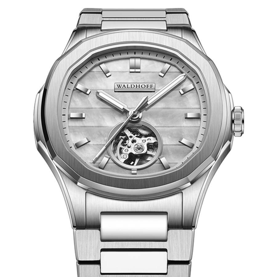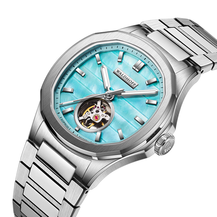 Silver-tone stainless steel case and bracelet. Fixed stainless steel bezel. Blue dial with silver-tone hands and index hour markers. Minute markers around the outer rim. Dial Type: Analog. Luminescent hands and markers. Soprod M100 automatic movement. Scratch resistant sapphire crystal. Pull / push crown. Transparent case back. Unique case shape, case size: 40 mm, case thickness: 10.6 mm. Deployment with push button release clasp. Water resistant at 30 meters / 100 feet. Functions: hour, minute, second. Additional Info: cnc shaped freshwater pearl dial. Navigator Series. Luxury watch style. Watch label: Swiss Made. Waldhoff Navigator Automatic Blue Mother of Pearl Dial Men's Watch MW-22-CM.
