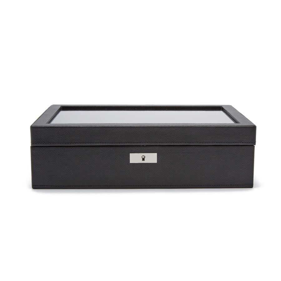 Inspired by the best of British motorcars, Jaguar, Aston Martin, Bristol and the like. Roadster 10 piece watch box with storage wrapped in leather with details of ebony macassar polished wood.
