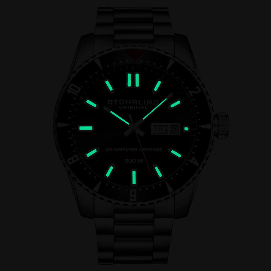Silver-tone stainless steel case and bracelet. Uni-directional rotating black stainless steel bezel. Black dial with silver-tone hands and index hour markers. Minute markers around the outer rim. Dial Type: Analog. Luminescent hands and markers. Day of the week and date display at the 3 o'clock position. Automatic movement. Scratch resistant mineral crystal. Screw down crown. Transparent case back. Round case shape, case size: 44 mm, case thickness: 16 mm. Band width: 22 mm, band length: 7.5 inches. Fold over clasp with a safety release. Water resistant at 200 meters / 660 feet. Functions: date, day, hour, minute, second. Aquadiver Series. Dive watch style. Stuhrling Original Aquadiver Automatic Black Dial Men's Watch M16769.