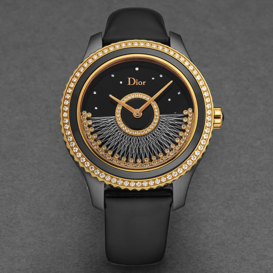 Black ceramic case with a black leather strap. Rose gold-tone 18kt rose gold with diamonds bezel. Black dial set with diamonds & rose gold accents dial with rose gold-tone hands. Dial Type: Analog. Automatic movement with a 42-hour power reserve. Scratch resistant sapphire crystal. Transparent see through case back. Round case shape, case size: 38 mm. Tang clasp. Water resistant at 50 meters / 165 feet. Functions: hour, minute, second. Sport watch style. Watch label: Swiss Made. Dior Automatic Diamond Ladies Watch CD124BH4A001.