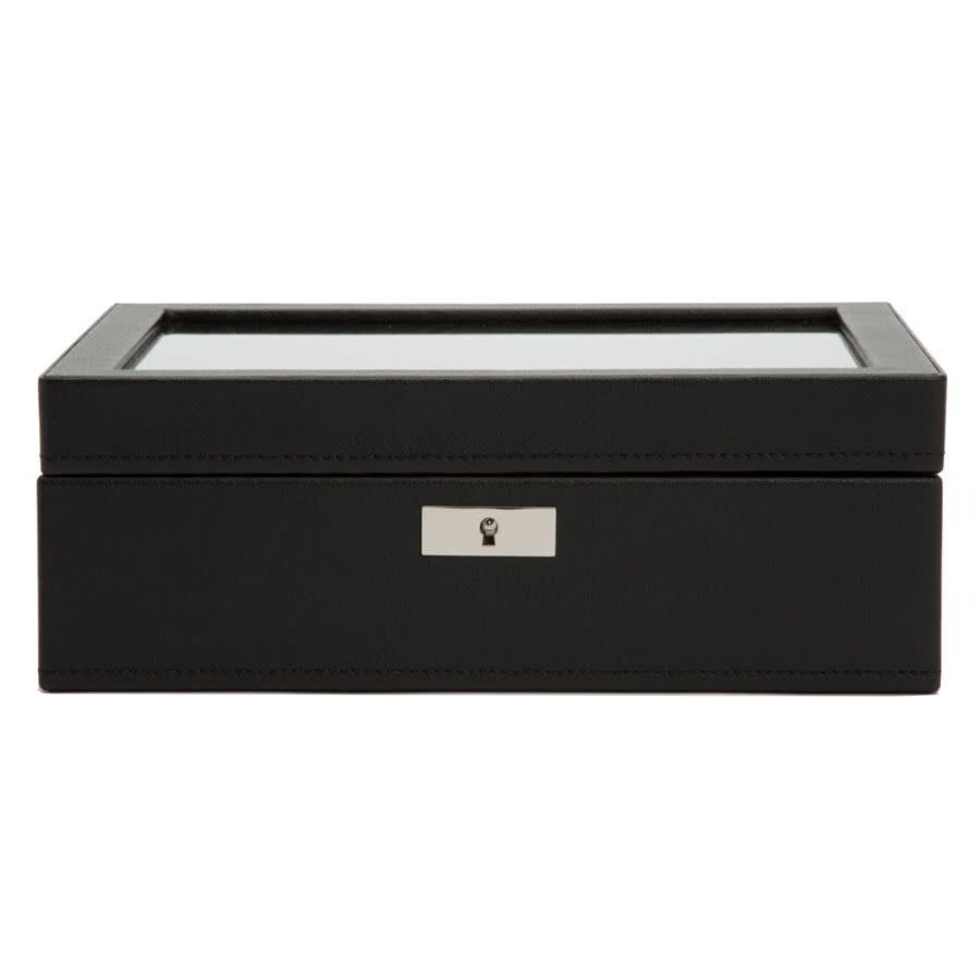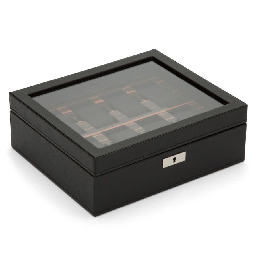 Inspired by the best of British motorcars, Jaguar, Aston Martin, Bristol and the like. Roadster 8 piece watch box wrapped in leather with details of ebony macassar polished wood.