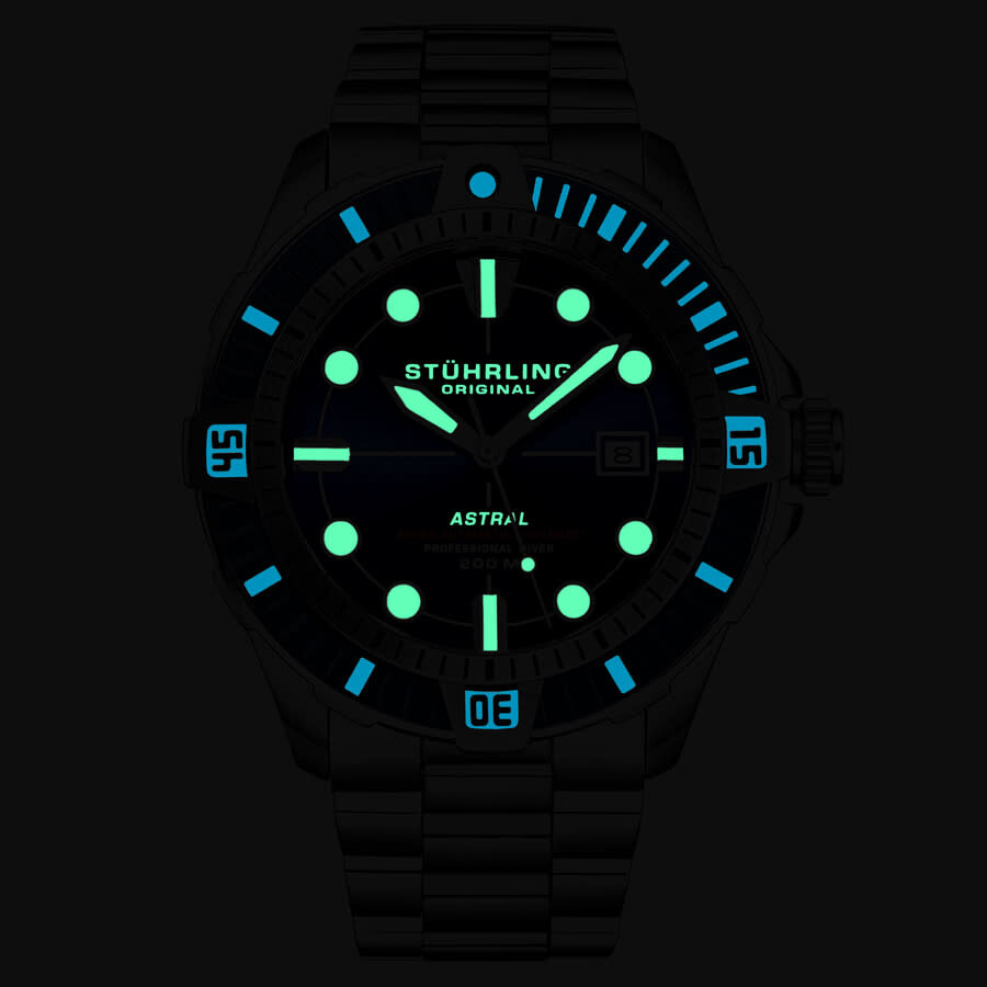 Silver-tone stainless steel case and bracelet. Uni-directional rotating blue stainless steel bezel. Blue dial with silver-tone hands and index hour markers. Minute markers around the outer rim. Dial Type: Analog. Luminescent hands and markers. Date display at the 3 o'clock position. Automatic movement. Scratch resistant mineral crystal. Screw down crown. Transparent case back. Round case shape, case size: 44 mm, case thickness: 14 mm. Band width: 24 mm, band length: 7.5 inches. Fold over clasp with a safety release. Water resistant at 200 meters / 660 feet. Functions: date, hour, minute, second. Aquadiver Series. Dive watch style. Stuhrling Original Aquadiver Automatic Blue Dial Men's Watch M16746.