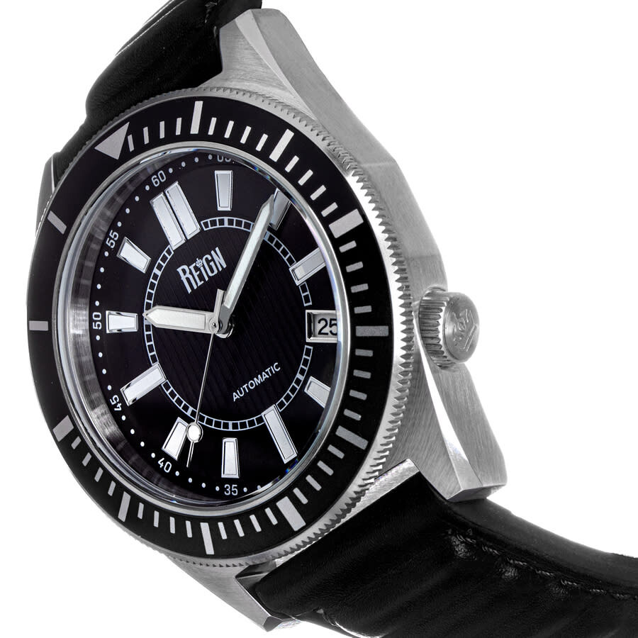 Band Color: Black Genuine Leather; Band Width: 22mm near case; 20mm near clasp/buckle; Bezel Color: Black; Case: Silver + Circle-Shaped; Case Finish: Brushed + Stainless Steel; Case Thickness: 14mm; Case Width: 42mm; 45mm with Crown; Clasp / Buckle: Strap Buckle; Dial: Black + Analog; Hand Color: Silver; Movement: Japanese + Automatic; Time Zones: Single; Water Resistance: 10 ATM.