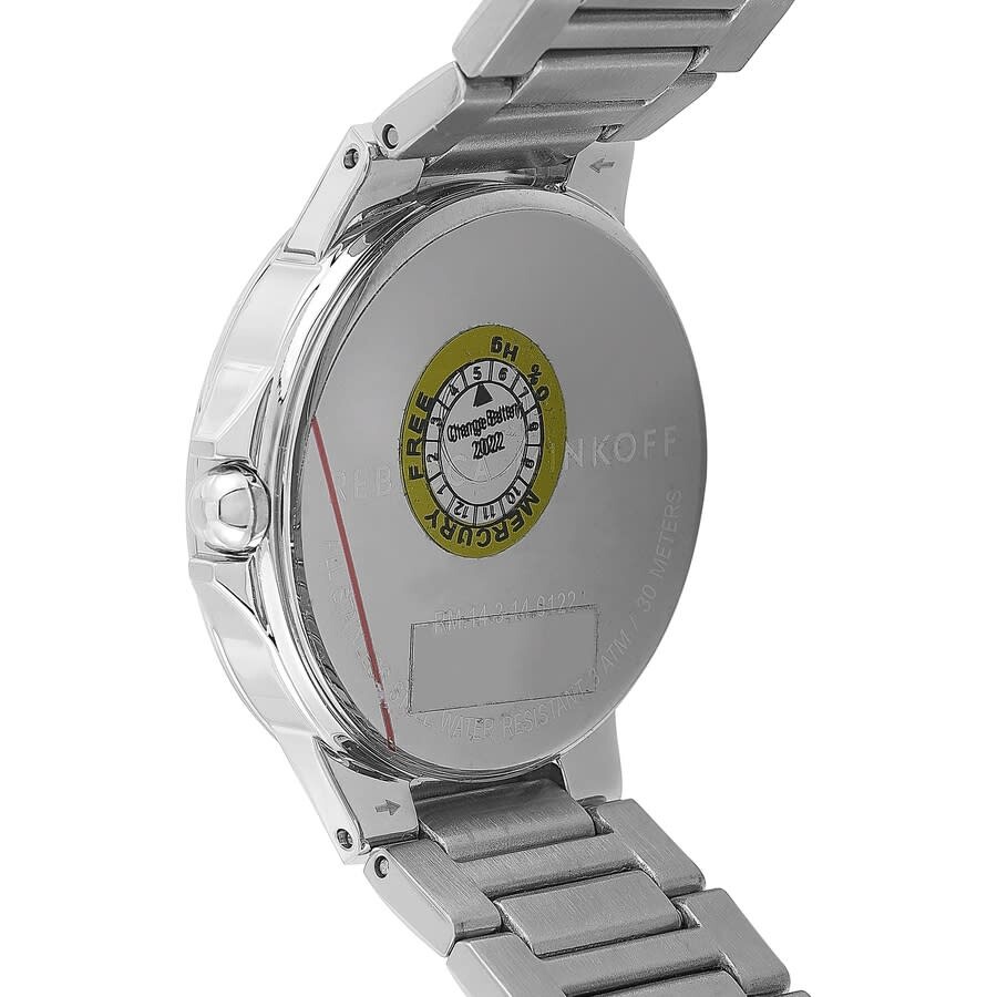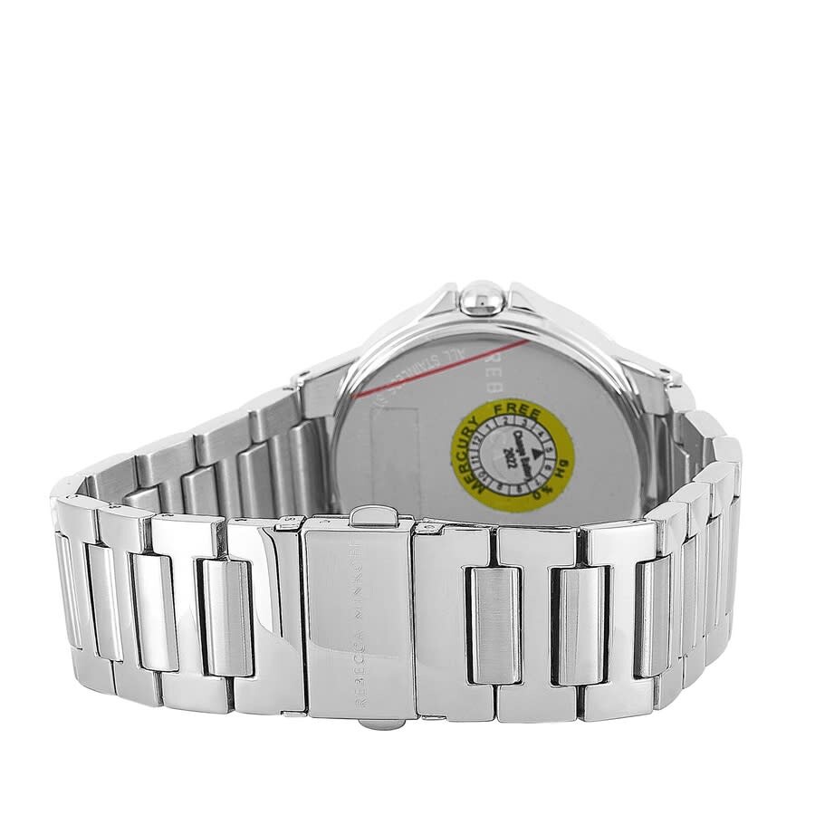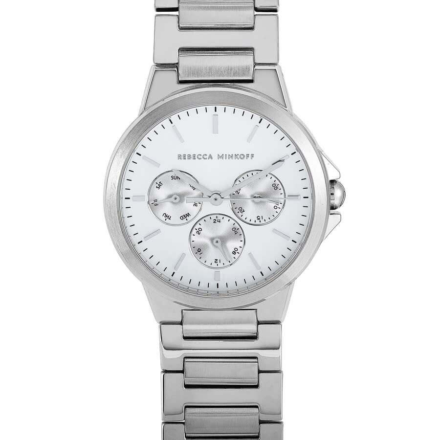 Stainless steel case with a stainless steel bracelet. Fixed stainless steel bezel. Silver white dial with silver-tone hands and index hour markers. Minute markers around the outer rim. Dial Type: Analog. Three multi-function sub-dials displaying: 24 hours, date and day of the week. Quartz movement. Scratch resistant mineral crystal. Pull / push crown. Solid case back. Round case shape. Case size: 36 mm. Case thickness: 8.6 mm. Band width: 20 mm. Fold over clasp with a push button release. Water resistant at 30 meters / 100 feet. Functions: date, day, hour, minute, second. Cali Series. Casual watch style. Rebecca Minkoff Cali Quartz Silver White Dial Ladies Watch 2200356.