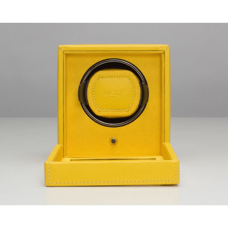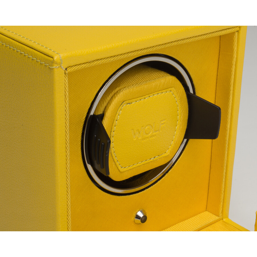 A meticulously engineered watch winder with a sharp design, the Cub includes a yellow Pebble finish, glass cover, yellow grosgrain faceplate, chrome finished hardware and a single winding module. Dimensions: 5.25'W X 6'D X 5.75'H Features: Rotation: 10 second start delay, 900 TPD (Turns Per Day), patented rotation programs - Intermittent rotation with pause and sleep phases pre-programmed.