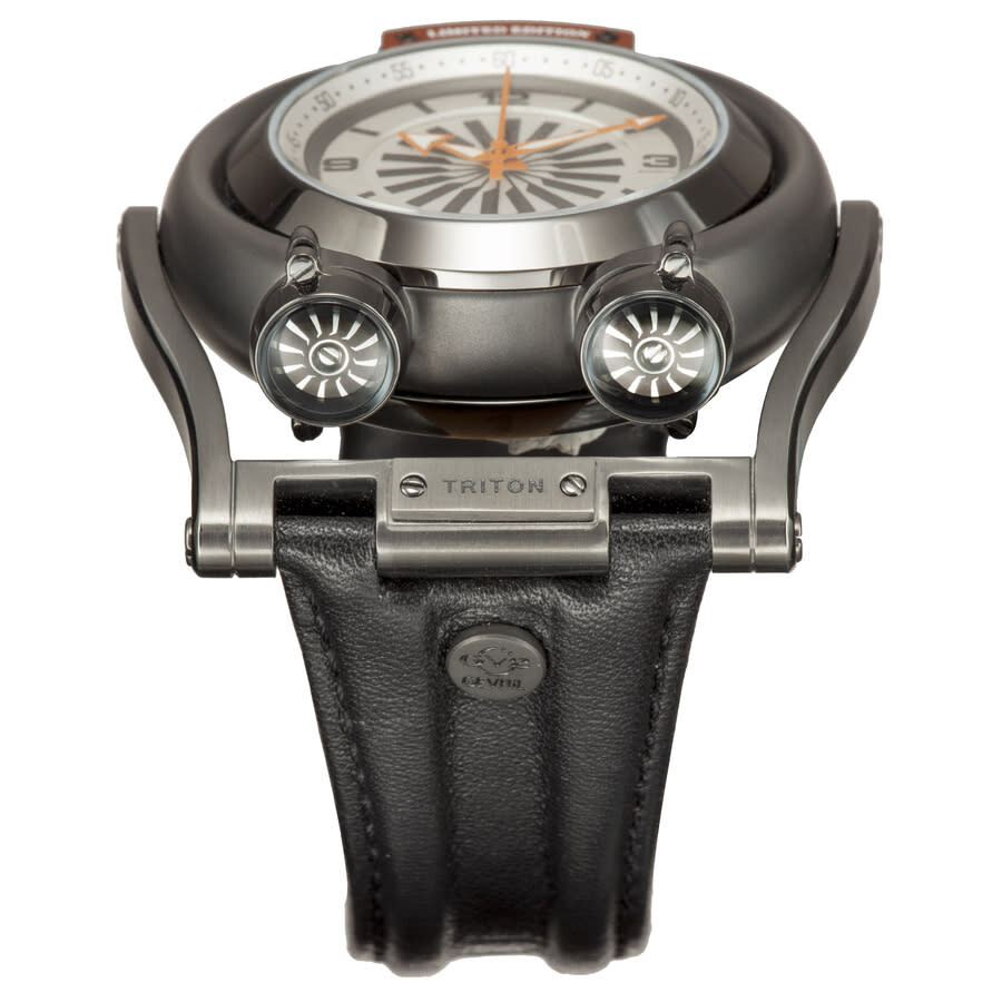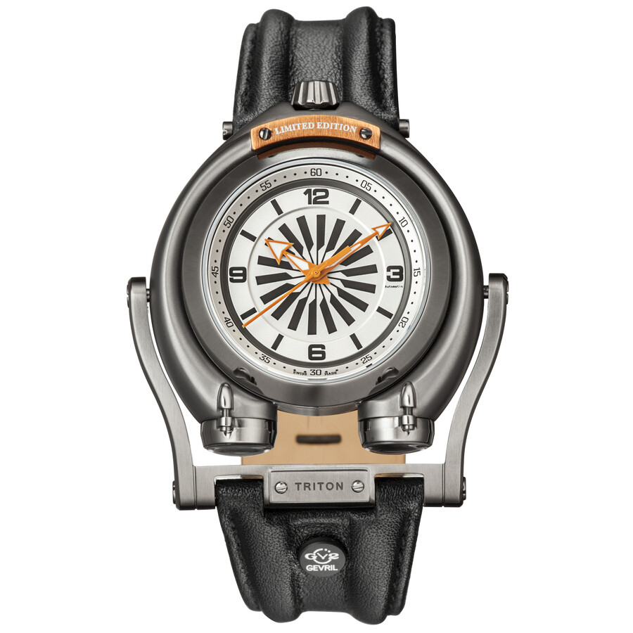 Gunmetal stainless steel case with a black leather strap. Fixed black stainless steel bezel. White dial with orange hands and Arabic numeral & index hour markers. Dial Type: Analog. Luminescent hands. Sellita Caliber SW200-1 Automatic movement, containing 26 Jewels, bitting at 28800 vph, and has a power reserve of approximately 38 hours. Scratch resistant sapphire crystal. Screw down crown. Solid case back. Round case shape, case size: 49 mm, case thickness: 17 mm. Band width: 22 mm. Buckle clasp. Water resistant at 50 meters / 165 feet. Functions: date, hour, minute, second. Triton Series. Luxury watch style. Watch label: Swiss Made. GV2 by Gevril Triton White Dial Men's Watch 3404S.