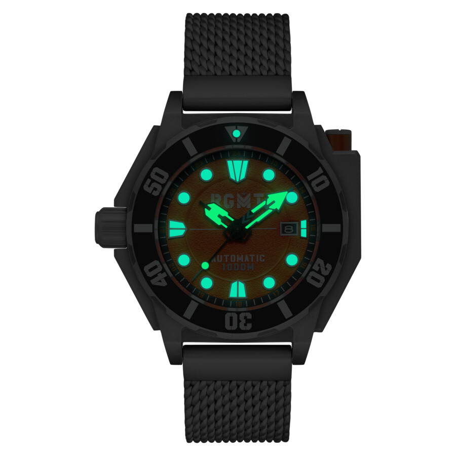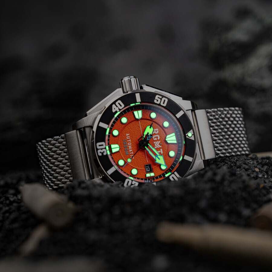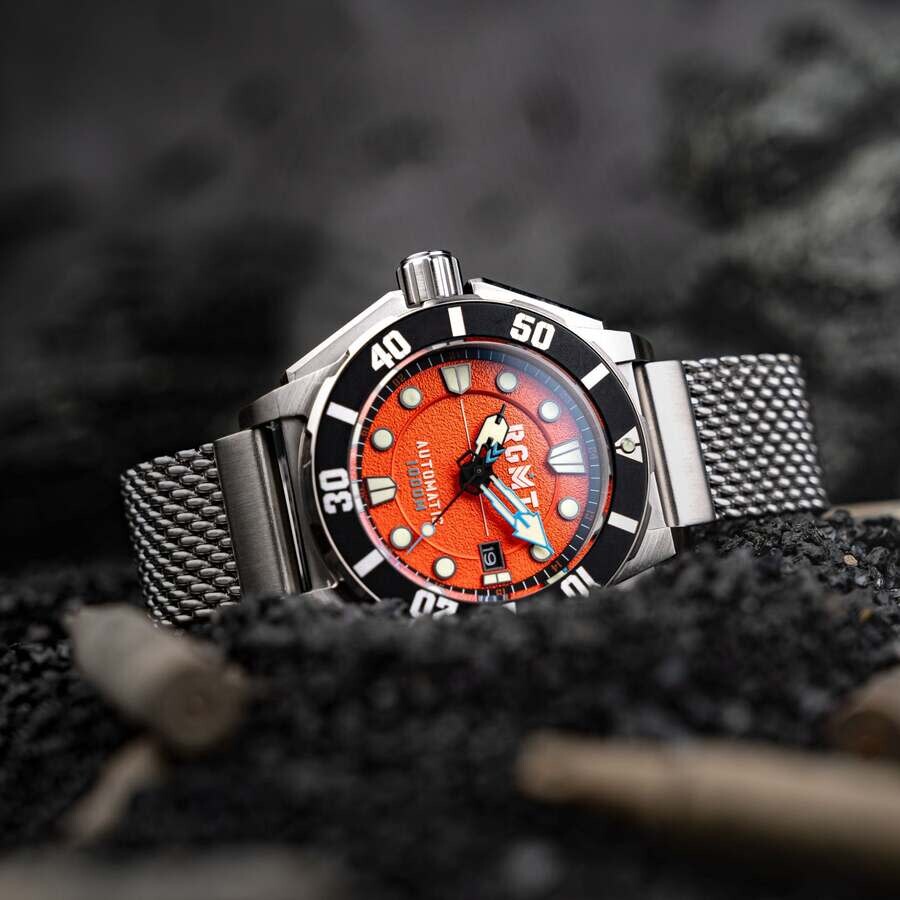 The Torpedo aims for performance. The case is marketd by its vertically aligned, automatically regulated helium release valve. Shaped and formed for deep dive performance the Torpedo is capable of 1000m of water resistance to serve in any condition on land or at speed beneath the waves. Silver-tone stainless steel case and bracelet. Bi-directional rotating black stainless steel bezel. Orange dial with black hands and Arabic numeral & index hour markers. Minute markers around the outer rim. Dial Type: Analog. Luminescent hands and markers. Date display at the 3 o'clock position. Seiko - NH35 automatic movement. Scratch resistant sapphire crystal. Screw down crown. Solid case back. Round case shape, case size: 51 mm, case thickness: 16 mm. Band width: 22 mm, band length: 8 inches. Fold over clasp. Water resistant at 100 meters / 330 feet. Functions: date, hour, minute, second. Torpedo Series. Casual watch style. RGMT Torpedo Orange Dial Men's Watch RG-8027-55.