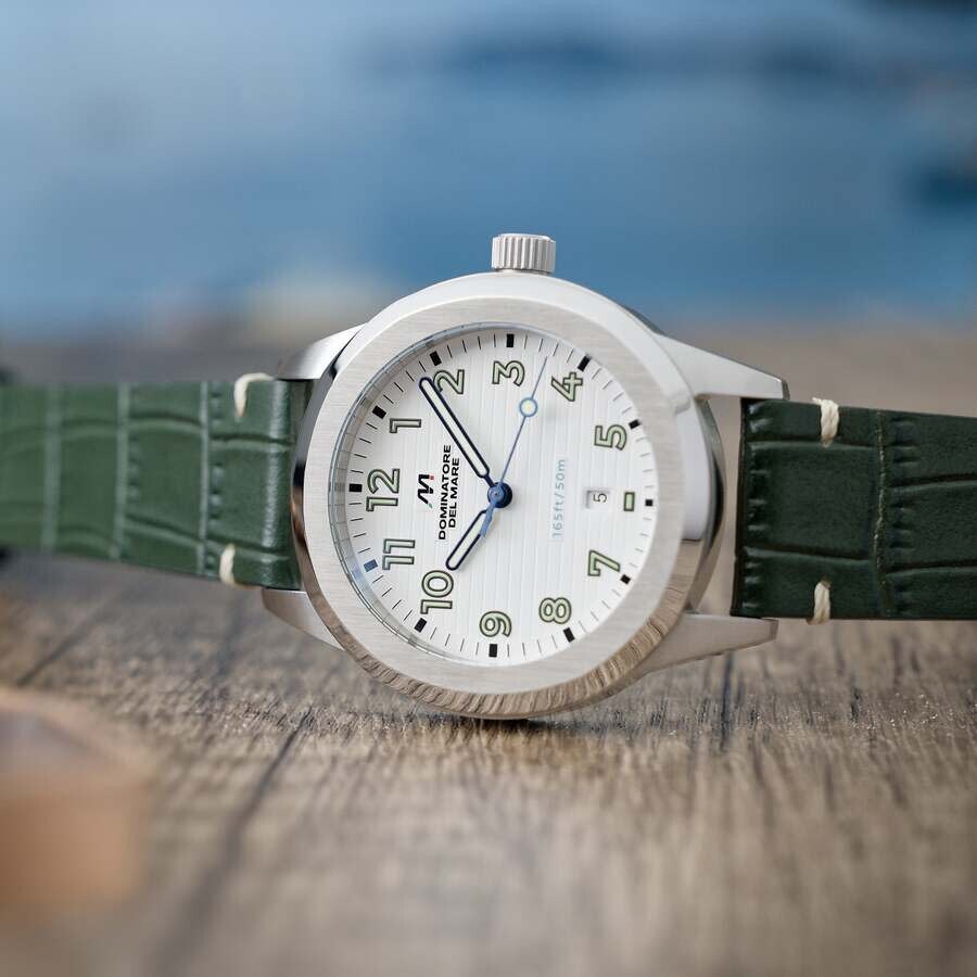 This is the perfect watch to accompany you on any occasion. Crafted with a stainless steel case and bezel and featuring a Japanese quartz movement and date display, the Aqua Sicura is both elegant and precise. The finely crafted dial ensures it looks just as good in a formal setting as it does during casual occasions. Silver-tone stainless steel case with a green leather strap. Fixed silver-tone stainless steel bezel. White dial with blue hands and Arabic numeral hour markers. Minute markers around the outer rim. Dial Type: Analog. Luminescent hands and markers. Date display at the 6 o'clock position. Seiko - VJ32 quartz movement. Pull / push crown. Solid case back. Round case shape, case size: 42 mm, case thickness: 11 mm. Band width: 20 mm, band length: 8 inches. Water resistant at 50 meters / 165 feet. Functions: date, hour, minute, second. Aqua Sicura Series. Casual watch style. Dominatore Del Mare Aqua Sicura Quartz White Dial Men's Watch DD-8022-05.