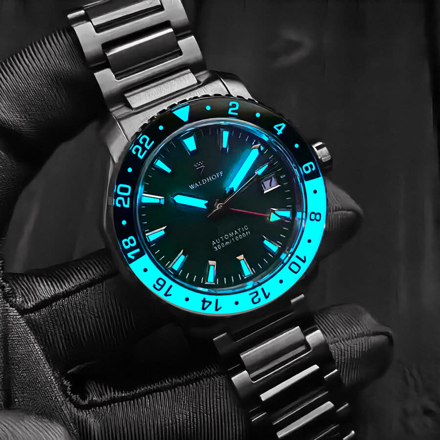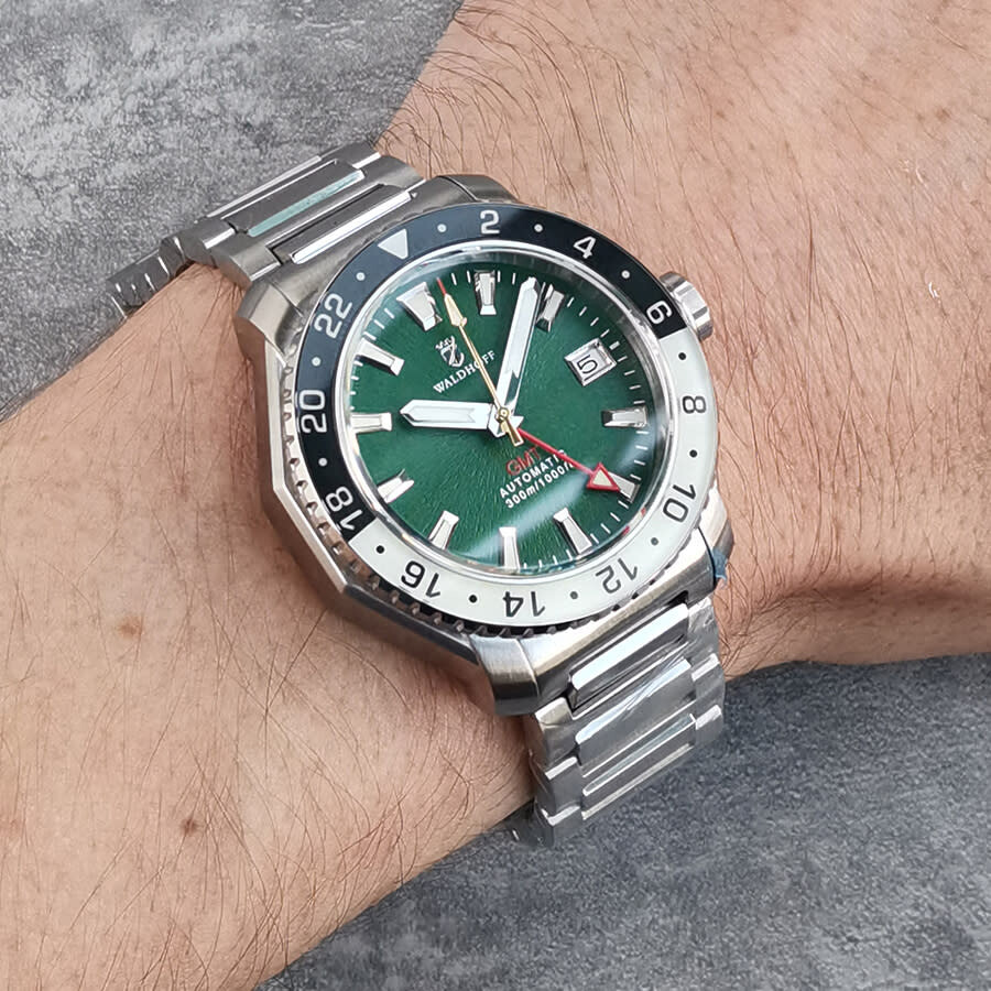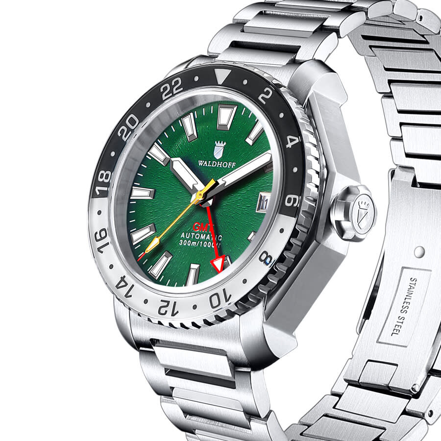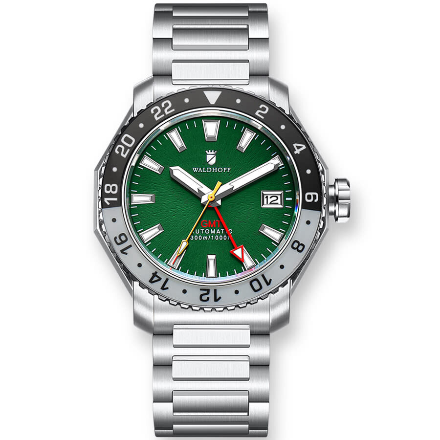 Silver-tone stainless steel case and bracelet. Bi-directional rotating black sapphire bezel. Silver-tone dial with silver-tone hands and index hour markers. Minute markers around the outer rim. Dial Type: Analog. Luminescent hands and markers. Date display at the 3 o'clock position. NH 34 GMT automatic movement. Scratch resistant sapphire crystal. Screw down crown. Solid case back. Unique case shape, case size: 40 mm, case thickness: 13.5 mm. Band width: 20 mm. Fold over clasp with a safety release. Water resistant at 300 meters / 1000 feet. Functions: date, hour, minute, second. Atlas Gmt Series. Dive watch style. Waldhoff Atlas GMT Automatic Silver Dial Men's Watch MW-23G-3S.