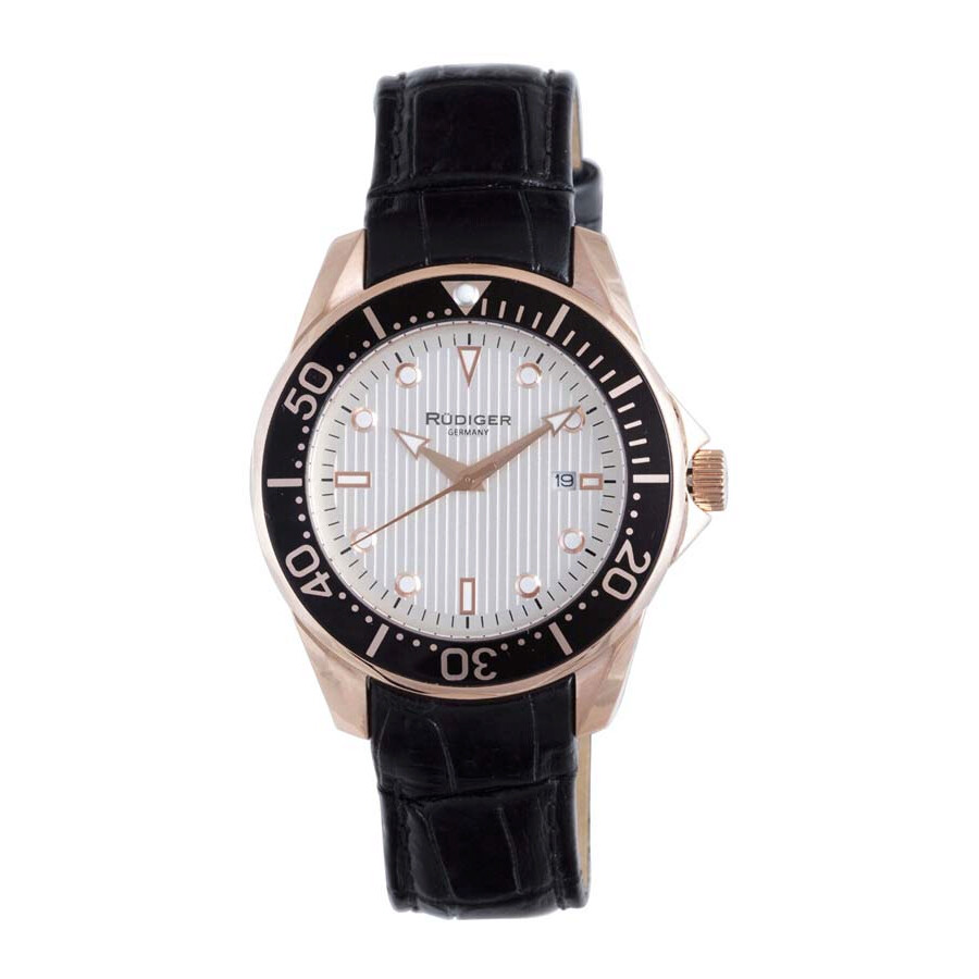 Rose gold-tone stainless steel case with a black leather strap. Unidirectional rotating rose gold-tone stainless steel bezel. White dial with rose gold-tone hands and index hour markers. Minute markers around the outer rim. Dial Type: Analog. Date display at the 3 o'clock position. Quartz movement. Scratch resistant mineral crystal. Push/pull crown. Solid case back. Round case shape, case size: 42 mm, case thickness: 11.5 mm. Band width: 20 mm, band length: 8.5 in. Buckle clasp. Water resistant at 50 meters / 165 feet. Functions: date, hour, minute, second. Casual watch style. Rudiger Chemnitz White Dial Men's Watch R2000-09-001L.