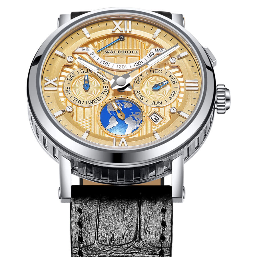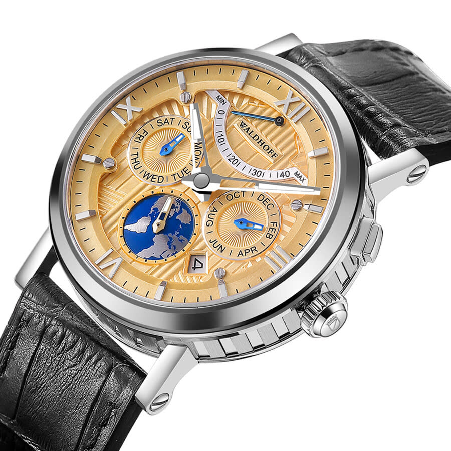 Silver-tone stainless steel case with a black calfskin band. Fixed silver-tone stainless steel bezel. Gold-tone dial with silver-tone hands and Roman numeral & index hour markers. Minute markers around the outer rim. Dial Type: Analog. Luminescent hands. Complete calendar. Power reserve, 24 hour subdials. Miyota caliber 9100 Automatic movement, containing 26 Jewels, bitting at 28800 vph, and has a power reserve of approximately 40 hours. Scratch resistant sapphire crystal. Pull / push crown. Transparent case back. Round case shape, case size: 41 mm, case thickness: 11.4 mm. Band width: 22 mm. Buckle clasp. Water resistant at 30 meters / 100 feet. Functions: full calendar, month, date, day, GMT, second time zone, hour, minute, second, power reserve indicator. Multimatic II Series. Luxury watch style. Watch label: Japan Movt. Waldhoff Multimatic II Automatic Gold Dial Men's Watch Multimatic II Hamilton Gold.