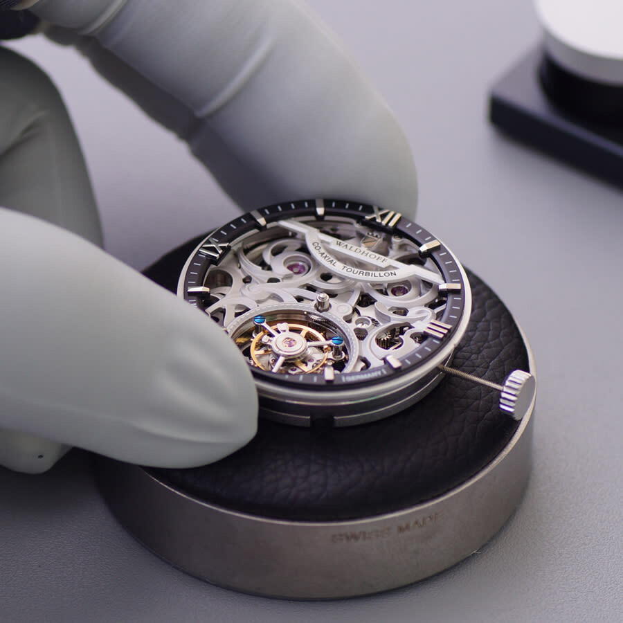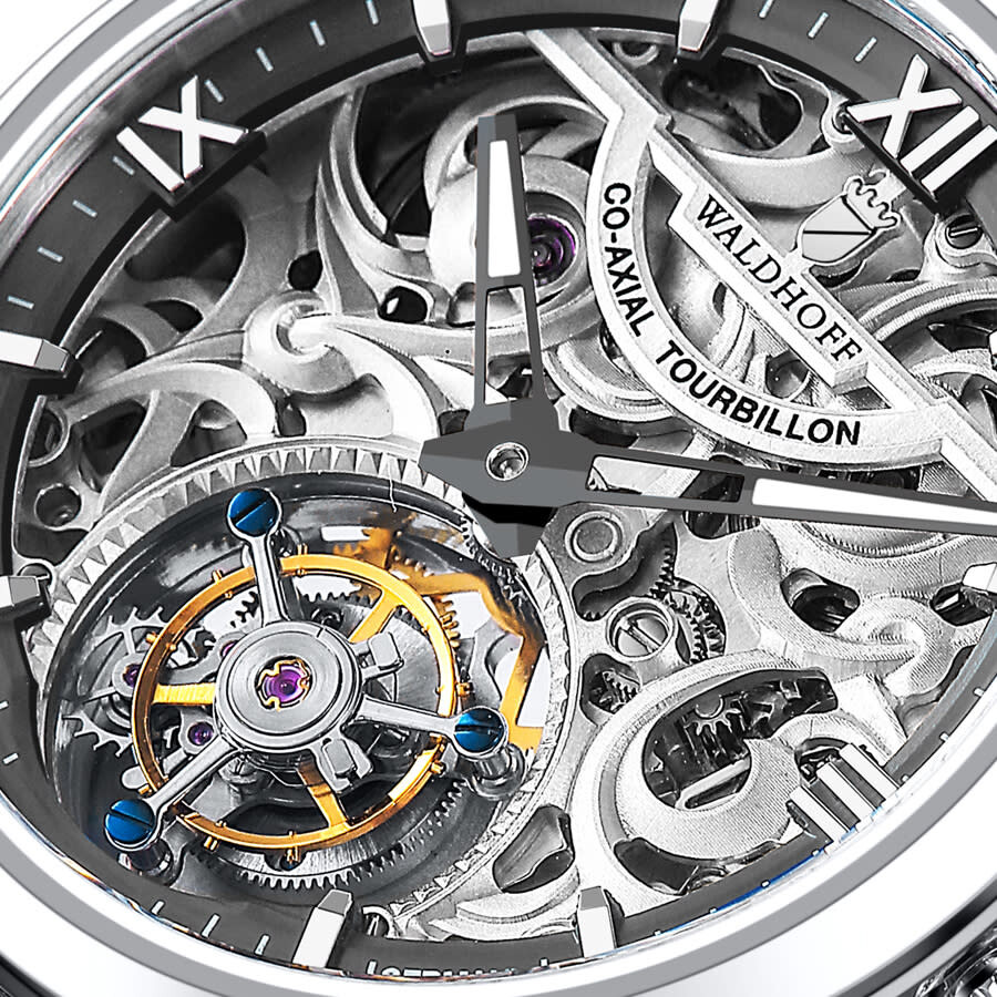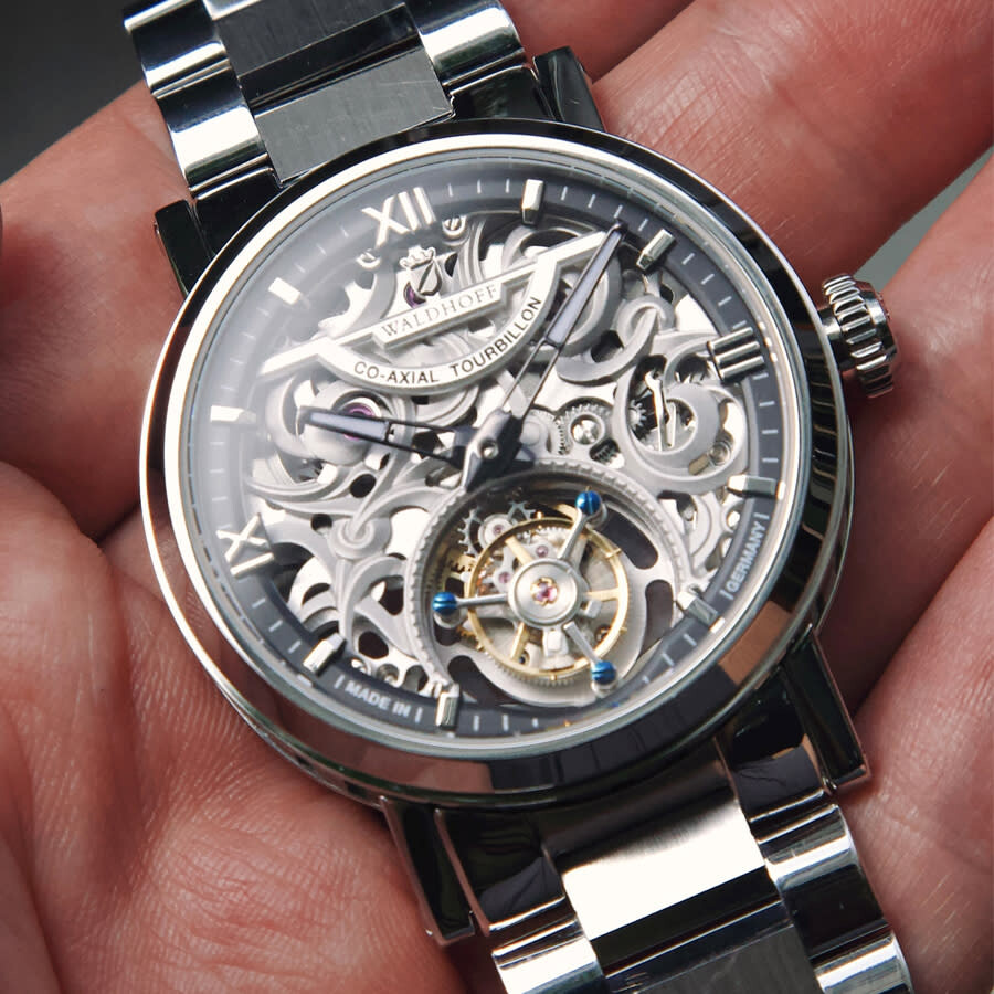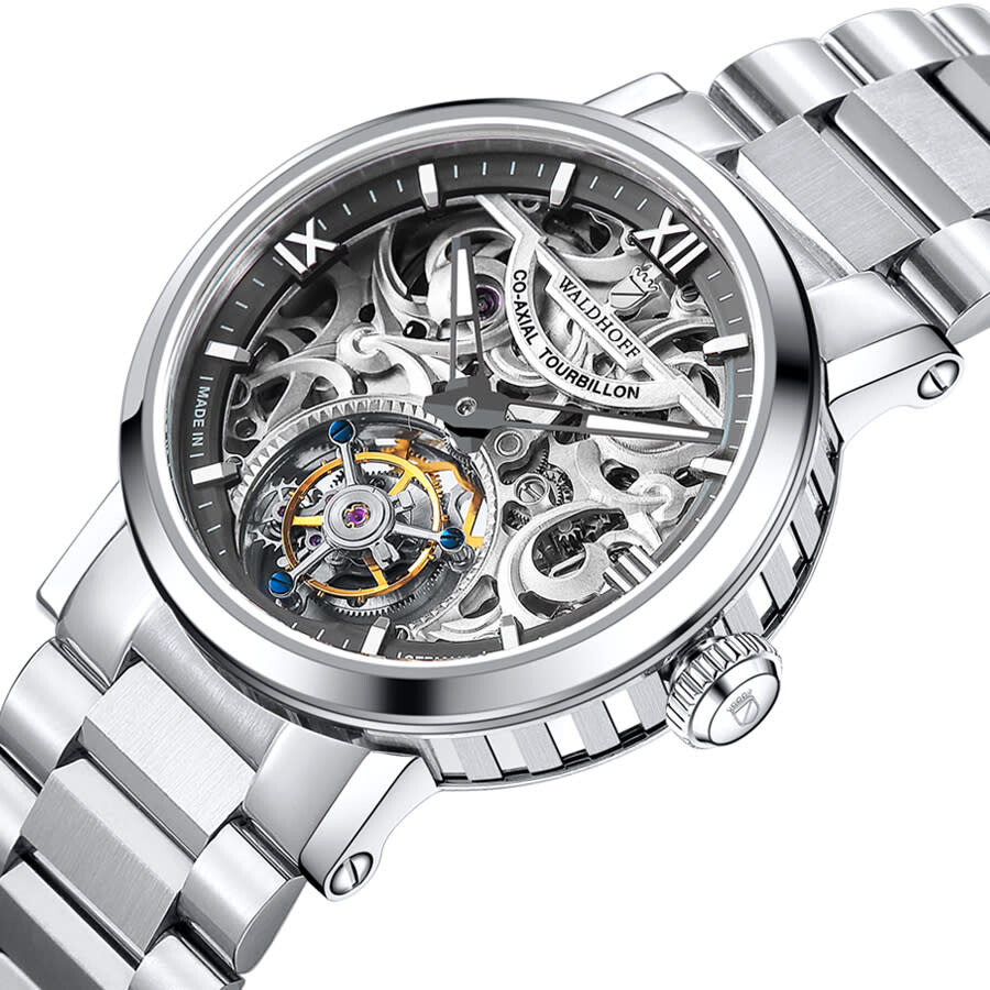 Metropolis Diamond Silver Tourbillon watch with stainless steel bracelet Silver-tone stainless steel case with a stainless steel bracelet. Fixed silver-tone stainless steel bezel. Silver-tone dial with black hands and Roman numeral & index hour markers. Minute markers around the outer rim. Dial Type: Analog. Luminescent hands. HZ 3452 hand wind movement. Scratch resistant sapphire crystal. Pull / push crown. Transparent case back. Round case shape, case size: 41 mm, case thickness: 11 mm. Band width: 22 mm. Hidden clasp. Water resistant at 30 meters / 100 feet. Functions: tourbillon, hour, minute. Metropolis Series. Luxury watch style. Waldhoff Metropolis Tourbillon Hand Wind Silver Dial Men's Watch MW-18AL.