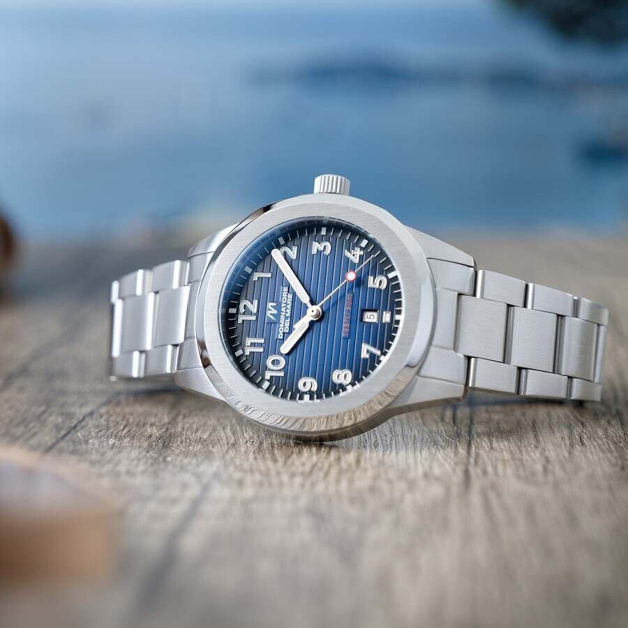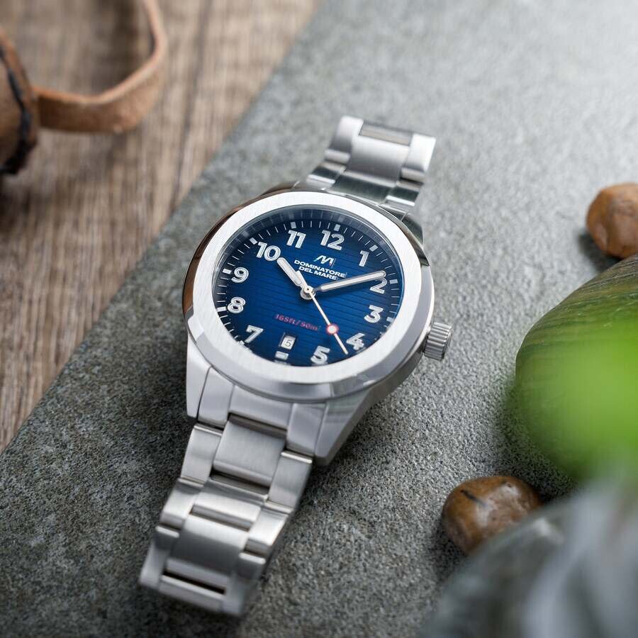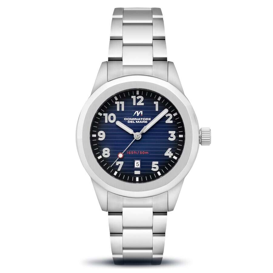 This is the perfect watch to accompany you on any occasion. Crafted with a stainless steel case and bezel and featuring a Japanese quartz movement and date display, the Aqua Sicura is both elegant and precise. The finely crafted dial ensures it looks just as good in a formal setting as it does during casual occasions. Silver-tone stainless steel case and bracelet. Fixed silver-tone stainless steel bezel. Blue dial with silver-tone hands and Arabic numeral hour markers. Minute markers around the outer rim. Dial Type: Analog. Luminescent hands and markers. Date display at the 6 o'clock position. Seiko - VJ32 quartz movement. Pull / push crown. Solid case back. Round case shape, case size: 42 mm, case thickness: 11 mm. Band width: 20 mm, band length: 8 inches. Fold over clasp with a safety release. Water resistant at 50 meters / 165 feet. Functions: date, hour, minute, second. Aqua Sicura Series. Casual watch style. Dominatore Del Mare Aqua Sicura Quartz Blue Dial Men's Watch DD-8022-55.