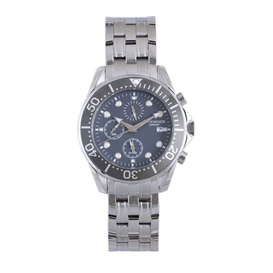 Silver-tone stainless steel case with a silver stainless steel bracelet. Unidirectional rotating silver-tone stainless steel bezel. Blue dial with silver-tone hands and index hour markers. Minute markers around the outer rim. Dial Type: Analog. Date display at the 3 o'clock position. Chronograph - three sub-dials displaying: chrono, 60 seconds and 1/20th of a second. Quartz movement. Scratch resistant mineral crystal. Push/pull crown. Solid case back. Round case shape, case size: 42 mm, case thickness: 11.5 mm. Band width: 20 mm, band length: 8.5 in. Fold over clasp. Water resistant at 50 meters / 165 feet. Functions: chronograph, hour, minute, second, date. Casual watch style. Rudiger Chemnitz Chronograph Blue Dial Men's Watch R2001-04-011.