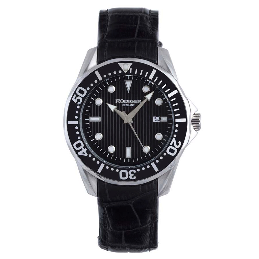 Silver-tone stainless steel case with a black leather strap. Unidirectional rotating silver-tone stainless steel bezel. Black dial with silver-tone hands and index hour markers. Minute markers around the outer rim. Dial Type: Analog. Date display at the 3 o'clock position. Quartz movement. Scratch resistant mineral crystal. Push/pull crown. Solid case back. Round case shape, case size: 42 mm, case thickness: 11.5 mm. Band width: 20 mm, band length: 8.5 in. Buckle clasp. Water resistant at 50 meters / 165 feet. Functions: date, hour, minute, second. Casual watch style. Rudiger Chemnitz Black Dial Men's Watch R2000-04-007L.