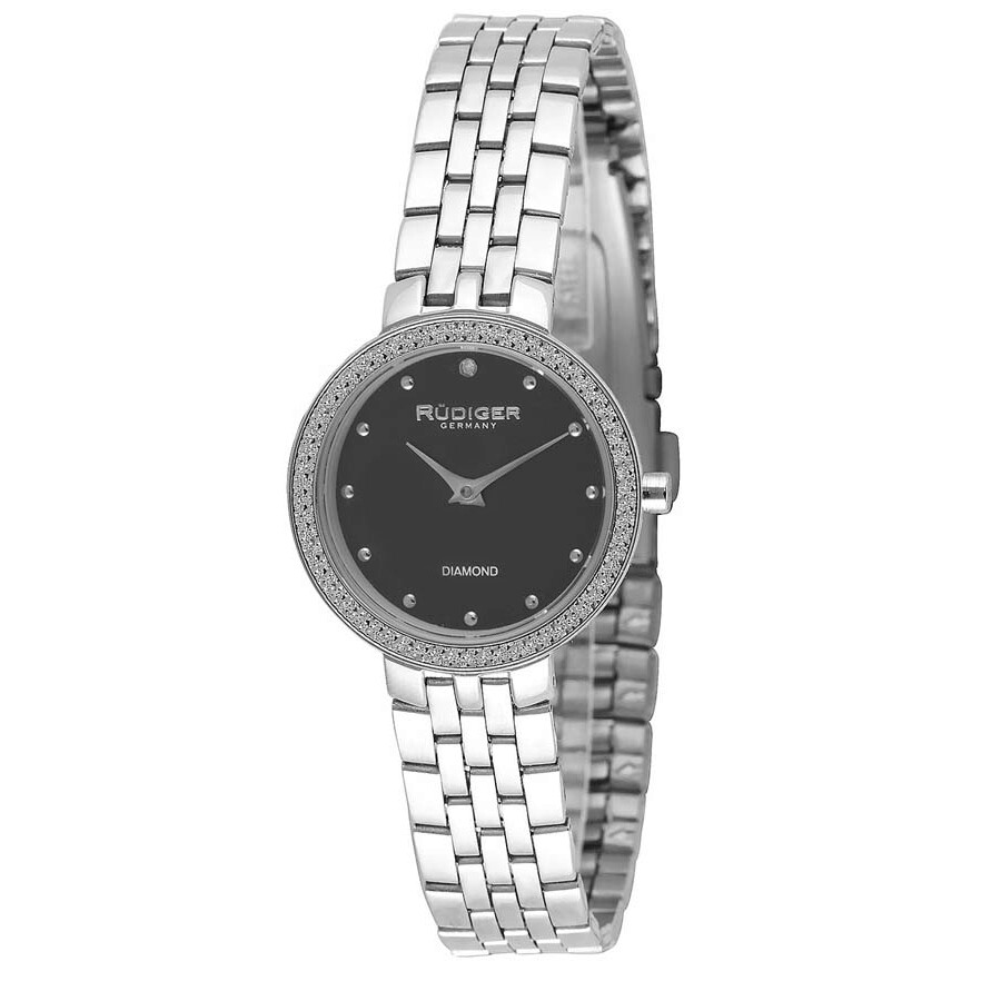 Silver-tone stainless steel case with a silver stainless steel bracelet. Fixed silver-tone stainless steel bezel. Black dial with silver-tone hands and index hour markers. Dial Type: Analog. Quartz movement. Scratch resistant mineral crystal. Push/pull crown. Solid case back. Round case shape, case size: 26 mm, case thickness: 6.75 mm. Band width: 11.6 mm, band length: 7.5 in. Fold over clasp. Water resistant at 50 meters / 165 feet. Functions: hour, minute. Casual watch style. Rudiger Hesse Black Dial Ladies Watch R3300-04-007.