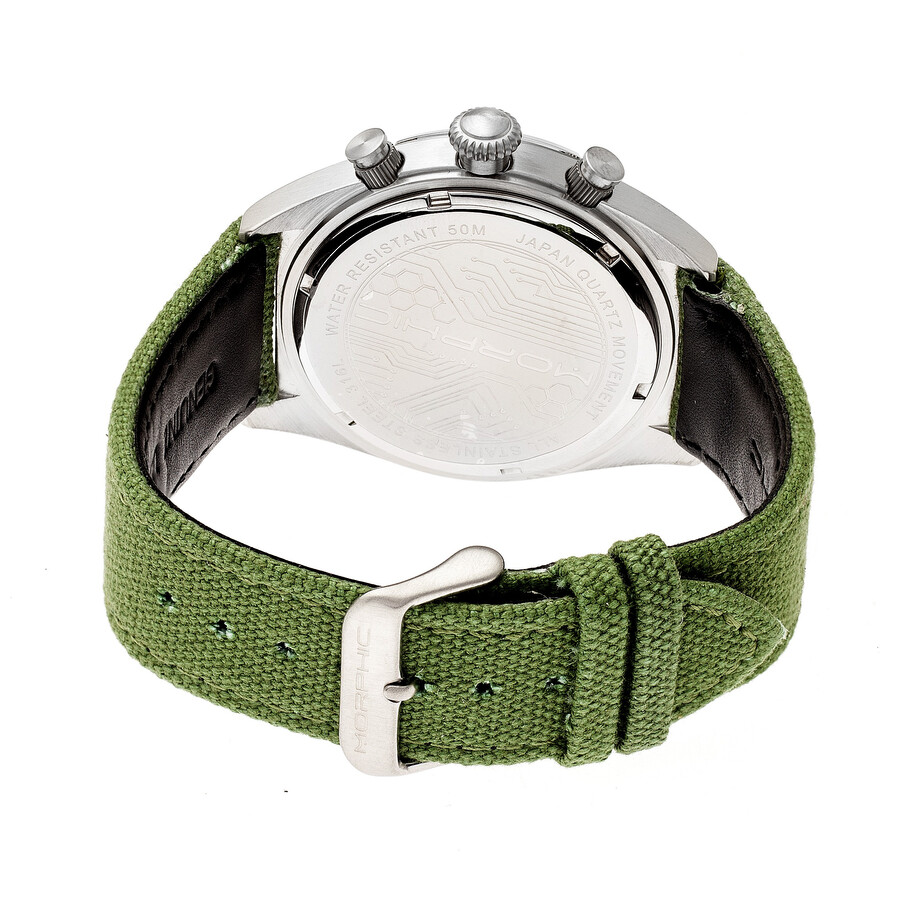 Silver-tone stainless steel case with a olive leather strap. Uni-directional rotating silver-tone bezel. Olive dial with black hands and Arabic numeral hour markers. Tachymeter scale around the outer rim. Dial Type: Analog. Luminescent hands and markers. Date display between 4 and 5 o'clock position. Chronograph - three sub-dials displaying: 60 second, 30 minute and 24 hour. Quartz movement. Scratch resistant mineral crystal. Round case shape, case size: 45 mm, case thickness: 12 mm. Band width: 24 mm. Buckle clasp. Water resistant at 50 meters / 165 feet. Functions: chronograph, date, GMT, second time zone, hour, minute, second. Sport watch style. Watch label: Japan Movt. Item Variations: MPH5302. Morphic M53 Series Chronograph Men's Watch 5302.