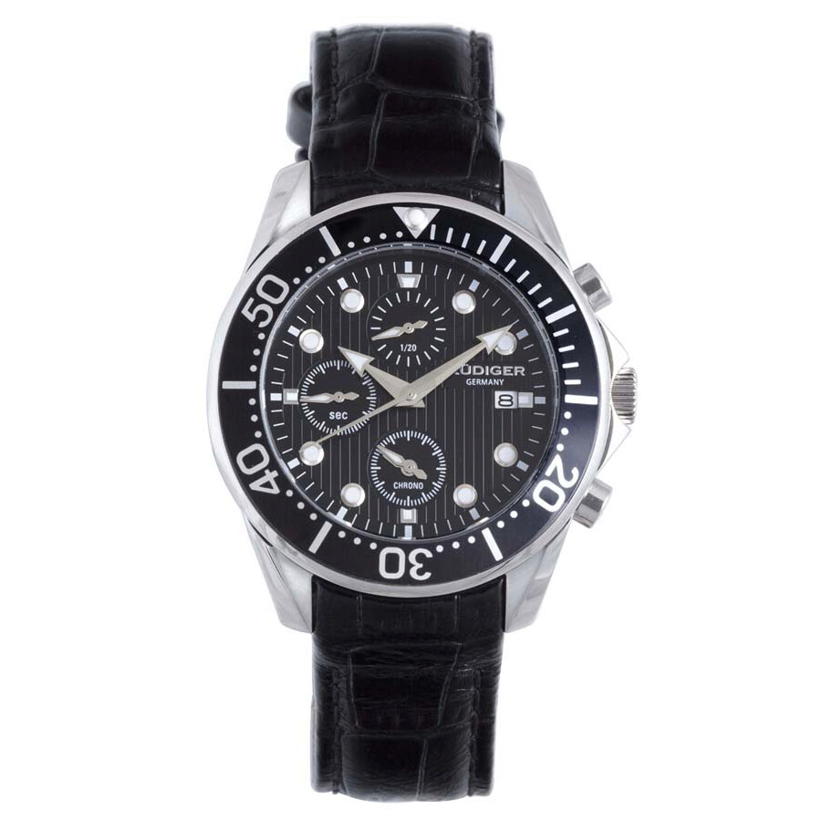 Silver-tone stainless steel case with a black leather strap. Unidirectional rotating silver-tone stainless steel bezel. Black dial with silver-tone hands and index hour markers. Minute markers around the outer rim. Dial Type: Analog. Date display at the 3 o'clock position. Chronograph - three sub-dials displaying: chrono, 60 seconds and 1/20th of a second. Quartz movement. Scratch resistant mineral crystal. Push/pull crown. Solid case back. Round case shape, case size: 42 mm, case thickness: 11.5 mm. Band width: 20 mm, band length: 8.5 in. Buckle clasp. Water resistant at 50 meters / 165 feet. Functions: chronograph, hour, minute, second, date. Casual watch style. Rudiger Chemnitz Chronograph Black Dial Men's Watch R2001-04-007L.