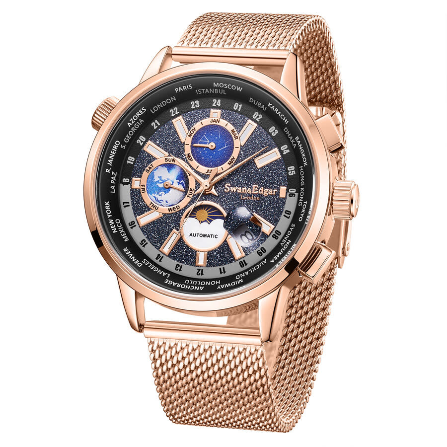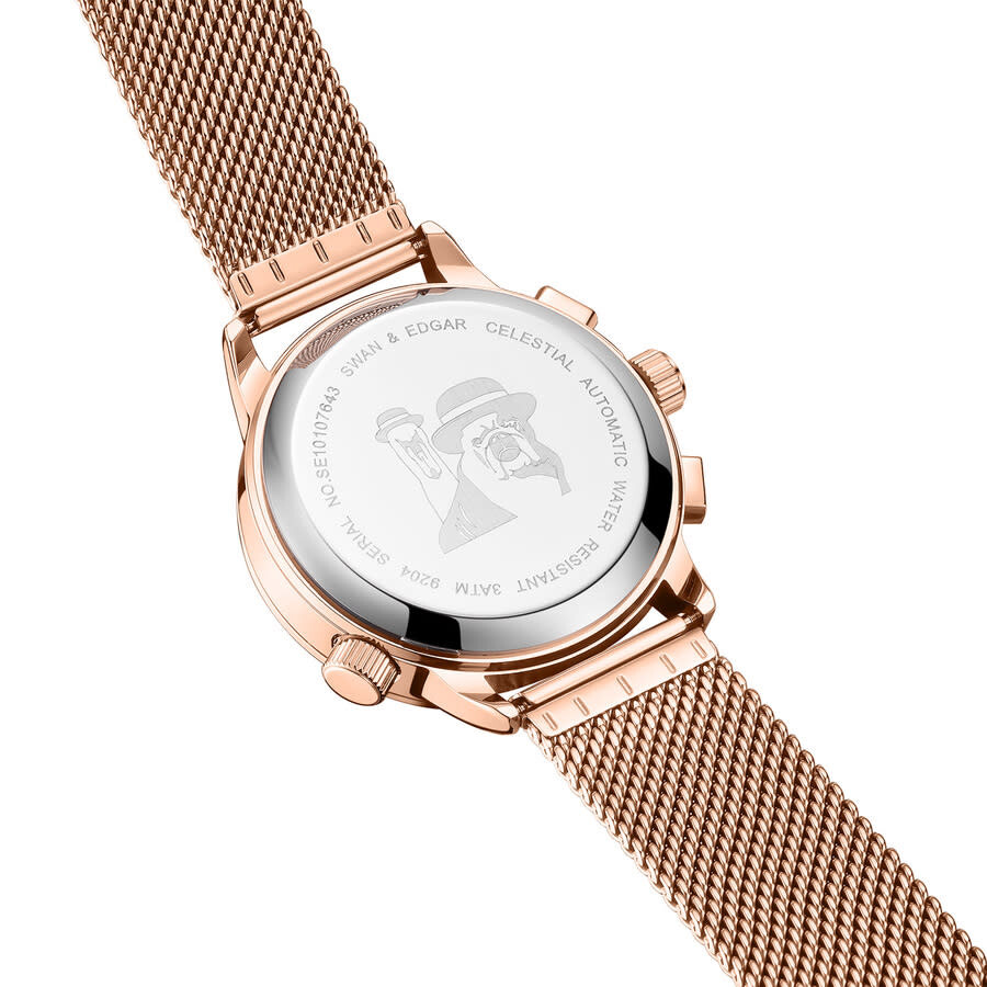 The Limited Edition Swan & Edgar Hand Assembled Blackheath Welkin Automatic Rose Black men’s watch takes its name from the street on which the Royal Observatory is located. For many, this is the closest view they will ever have of the vast and mysterious expanse above, providing near-unfettered access to the sky and heavens that may possess the answers you hope to find. Precise and intricate 163 Part 20 Jewel Hand Assembled Automatic Movement powers the arrow-like hands that glide around the star black dial. This is set within a rose gold IP case and is detailed with a functional world timer that provides answers anywhere across the glove. The Day, Date and Month Counters provide finishing features that include images of the earth, sky and afar. The rose gold bracelet and Swan & Edgar logo-engraved stainless steel caseback complete the timepiece, offering the comfortable feeling of safety and security with two feet on the ground while you dream of what secrets exist beyond the atm
