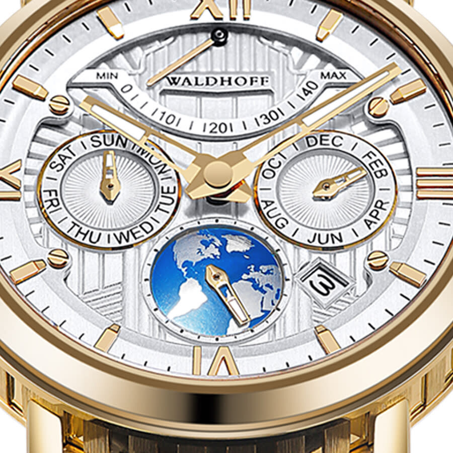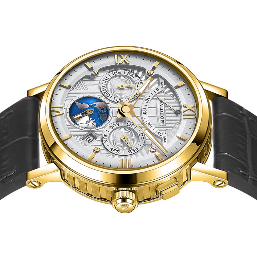 Yellow gold-tone stainless steel case with a black calfskin band. Fixed yellow gold-tone stainless steel bezel. Silver-tone dial with yellow gold-tone hands and Roman numeral & index hour markers. Minute markers around the outer rim. Dial Type: Analog. Luminescent hands. Complete calendar. Power reserve, date, day, day of the week, month subdials. Miyota caliber 9100 Automatic movement, containing 26 Jewels, bitting at 28800 vph, and has a power reserve of approximately 40 hours. Scratch resistant sapphire crystal. Pull / push crown. Transparent case back. Round case shape, case size: 41 mm, case thickness: 11.4 mm. Band width: 22 mm. Buckle clasp. Water resistant at 30 meters / 100 feet. Functions: full calendar, month, date, day, GMT, second time zone, hour, minute, second, power reserve indicator. Multimatic II Imperial Gold Series. Luxury watch style. Watch label: Japan Movt. Waldhoff Multimatic II Imperial Gold Automatic Silver Dial Men's Watch MW-16E.
