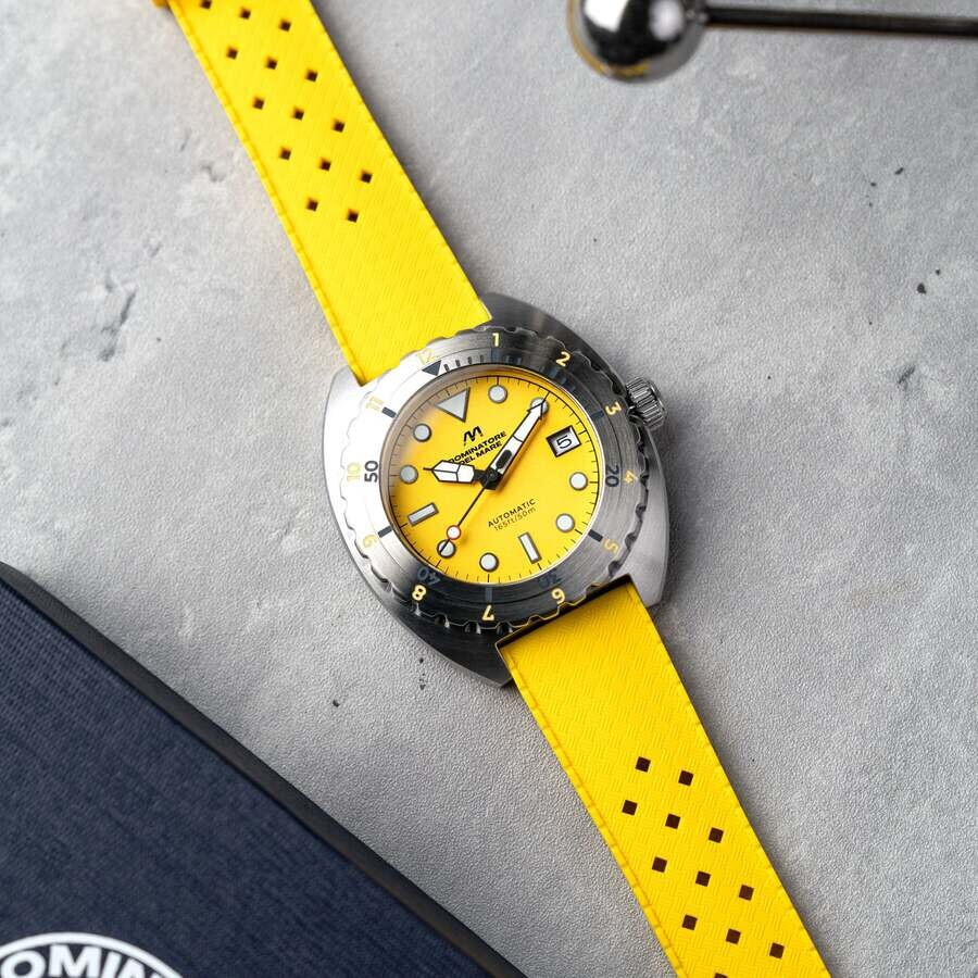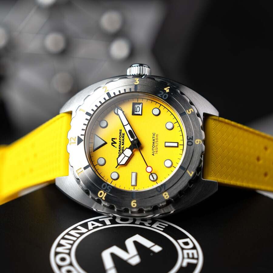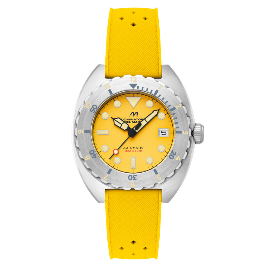 Experience the beauty of Amalfi with this masterfully crafted timepiece. inspired by the breathtaking landscape of the coastal town, this collection presents a bold cushion case shape with vibrant colour options. With Seiko NH35 automatic movement and unidirectional turning bezel, the Amalfi Automatic is energetic, stylish, and durable. Silver-tone stainless steel case with a yellow silicone strap. Uni-directional rotating silver-tone stainless steel bezel. Yellow dial with black hands and index hour markers. Minute markers around the outer rim. Dial Type: Analog. Luminescent hands and markers. Date display at the 3 o'clock position. Seiko - NH35 automatic movement. Scratch resistant mineral crystal. Pull / push crown. Solid case back. Round case shape, case size: 44 mm, case thickness: 14 mm. Band width: 20 mm, band length: 8 inches. Buckle clasp. Water resistant at 50 meters / 165 feet. Functions: date, hour, minute, second. Amalfi Series. Casual watch style. Dominatore Del Mare Amalfi Yellow Dial Men's Watch DD-8028-06.