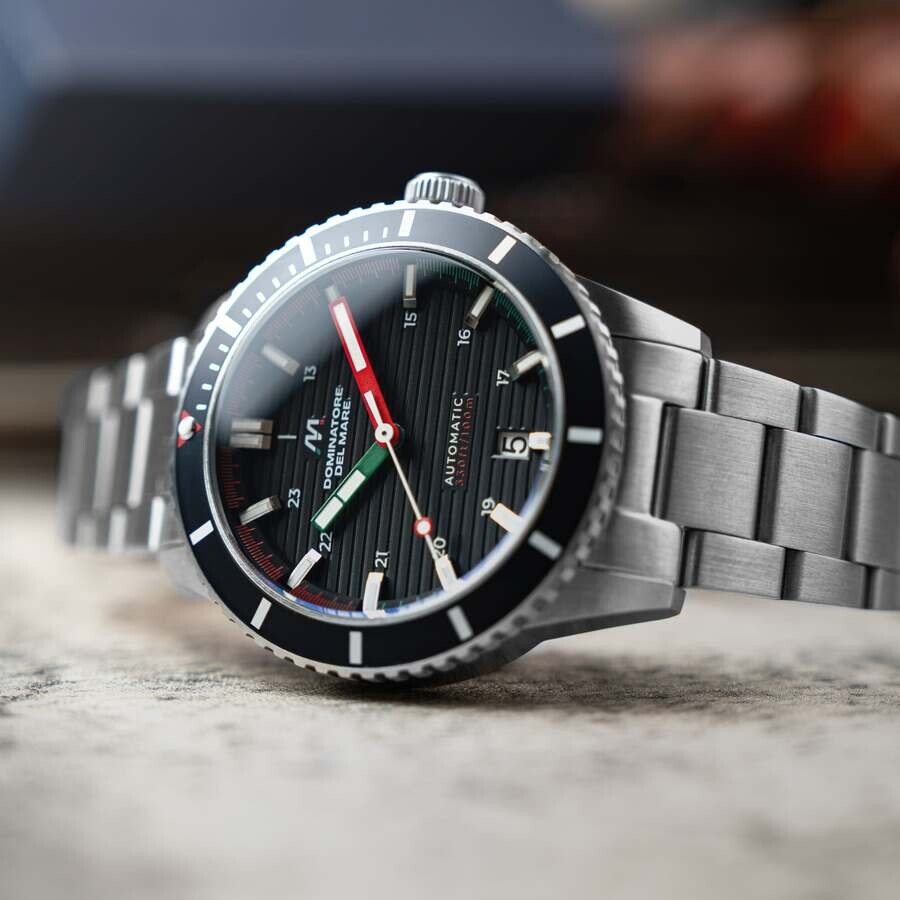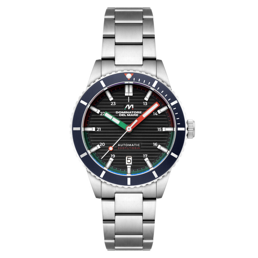 The Scilla Automatic is a diver watch that combines flair with a touch of playfulness. The vibrant colours on the hour and minute hands Silver-tone stainless steel case and bracelet. Uni-directional rotating blue stainless steel bezel. Black dial with red hands and index hour markers. Minute markers around the outer rim. Dial Type: Analog. Luminescent hands and markers. Date display at the 6 o'clock position. Seiko - NH35 automatic movement. Scratch resistant mineral crystal. Pull / push crown. Solid case back. Round case shape, case size: 42 mm, case thickness: 14 mm. Band width: 20 mm, band length: 8 inches. Fold over clasp. Water resistant at 100 meters / 330 feet. Functions: date, hour, minute, second. Scilla Series. Casual watch style. Dominatore Del Mare Scilla Black Dial Men's Watch DD-8027-11.