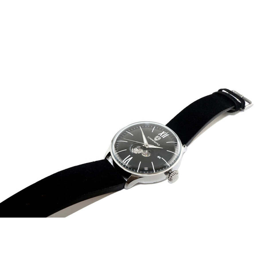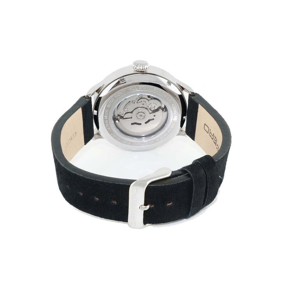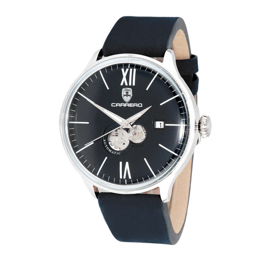TORINO CARRERO MEN'S WATCH, NH35 (24-JEWELS AUTOMATIC) WITH EXHIBITION BACK, OPEN HEART BEAT CURVE BLACK DIAL, STAINLESS STEEL CASE SILVER TONE, BLACK GENUINE LEATHER BAND Silver-tone stainless steel case with a black genuine leather strap. Fixed silver-tone stainless steel bezel. Black dial with silver-tone hands and Roman numeral & index hour markers. Minute markers around the outer rim. Dial Type: Analog. Luminescent hands. Date display at the 3 o'clock position. TMI Caliber NH35 Automatic movement, containing 24 Jewels, bitting at 21600 vph, and has a power reserve of approximately 41 hours. Scratch resistant mineral crystal. Pull / push crown. Transparent case back. Round case shape, case size: 45 mm, case thickness: 15.25 mm. Band width: 22 mm, band length: 7.5 inches. Buckle clasp. Water resistant at 100 meters / 330 feet. Functions: date, hour, minute, second. Additional Info: open heart. Aerodrome Series. Dress watch style. Watch label: Japan Movt. Torino Carrero Aerodrome Automatic Black Dial Men's Watch C1S1780-BKJ.