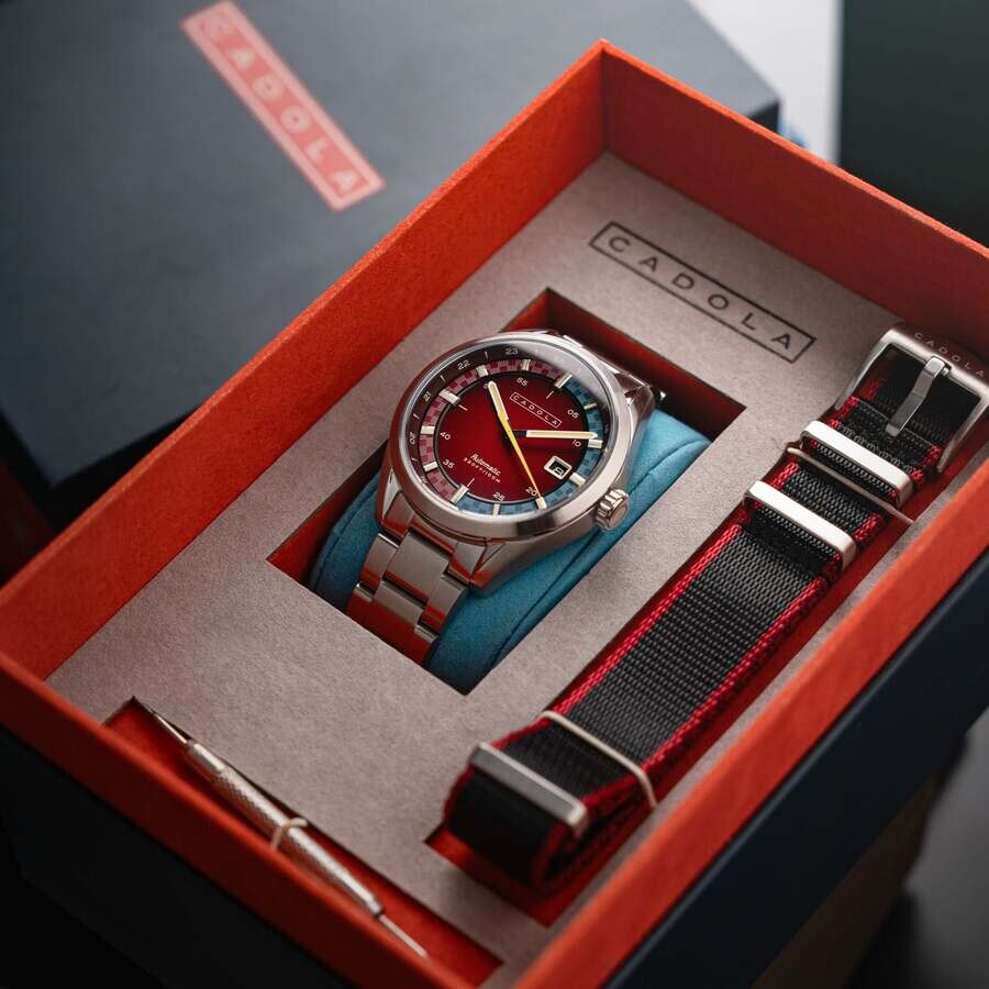 Paddock Automatic is a stylish and functional timepiece with Japanese Automatic Movement. Its 43mm size ensures comfortable fit, and vibrant dial colour adds to its distinct look. With the additional nylon strap, you can easily adjust the style. Keep track of the time and date with accurate precision. Silver-tone stainless steel case and bracelet. Fixed silver-tone stainless steel bezel. Red dial with silver-tone hands and Arabic numeral & index hour markers. Minute markers around the outer rim. Dial Type: Analog. Luminescent hands and markers. Date display at the 3 o'clock position. Seiko - NH35 automatic movement. Scratch resistant mineral crystal. Pull / push crown. Solid case back. Round case shape, case size: 43 mm, case thickness: 13 mm. Band width: 20 mm, band length: 8 inches. Fold over clasp with a safety release. Water resistant at 100 meters / 330 feet. Functions: date, hour, minute, second. Paddock Series. Casual watch style. Cadola Paddock Automatic Red Dial Men's Watch CD-1037-55.