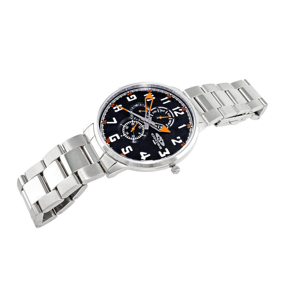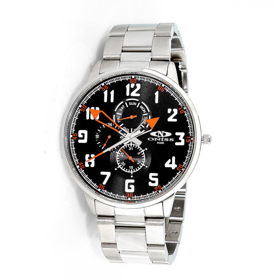 Silver-tone stainless steel case and bracelet. Fixed silver-tone stainless steel bezel. Black dial with silver-tone hands and Arabic numeral hour markers. Minute scale around the inner rim. Dial Type: Analog. Luminescent hands and markers. Day / date. 24 hour subdials. VX3NE quartz movement. Scratch resistant mineral crystal. Pull / push crown. Solid case back. Round case shape, case size: 45 mm, case thickness: 10.5 mm. Band width: 22 mm, band length: 7.25 inches. Fold over with double push button release clasp. Water resistant at 50 meters / 165 feet. Functions: date, day, hour, minute, second. On1818 Series. Fashion watch style. Watch label: Japan Movt. Oniss ON1818 Quartz Black Dial Men's Watch ONJ1818-MBKOR.