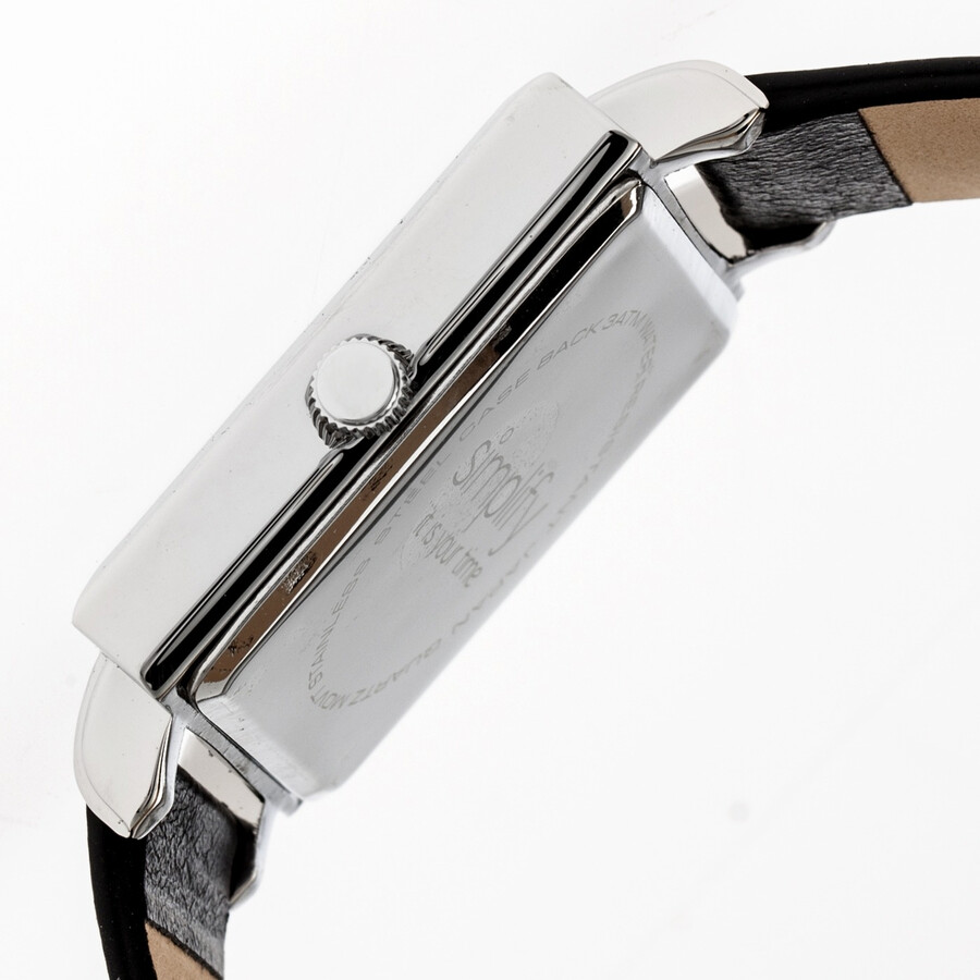 Silver-tone metal case with a black leather strap. Fixed silver-tone metal bezel. Blue dial with gold-tone hands and alternating Arabic numeral and index hour markers. Minute markers around the outer rim. Dial Type: Analog. Small seconds sub-dial. Quartz movement. Scratch resistant mineral crystal. Pull / push crown. Solid case back. Square case shape. Case size: 38 mm. Case thickness: 10 mm. Band width: 22 mm. Tang clasp. Water resistant at 30 meters / 100 feet. Functions: hour, minute, second. The 5000 Series. Casual watch style. Simplify The 5000 Blue Dial Black Leather Watch SIM5002.