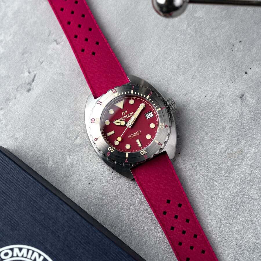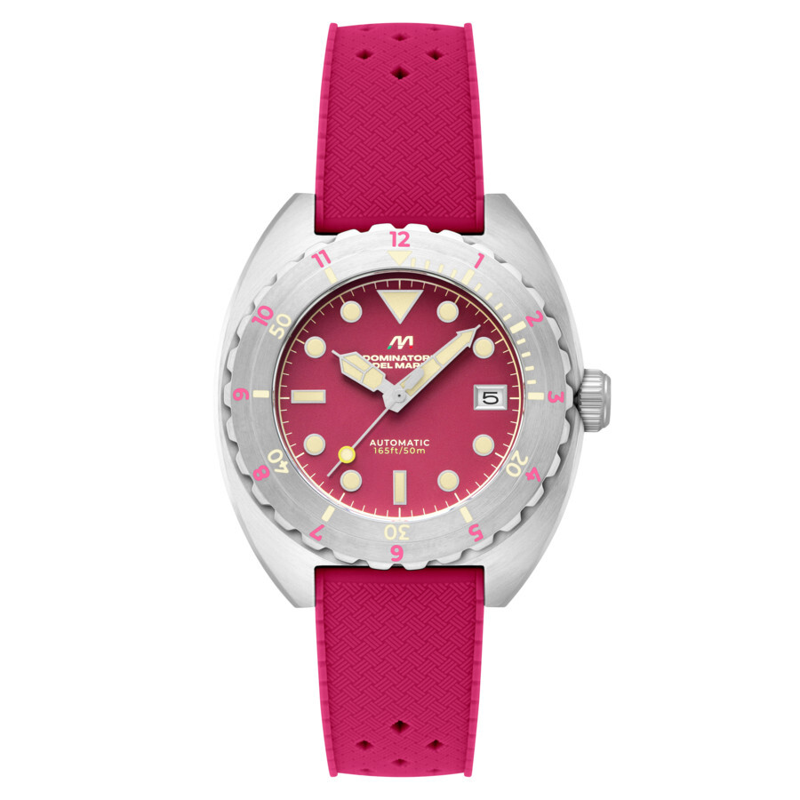 Experience the beauty of Amalfi with this masterfully crafted timepiece. inspired by the breathtaking landscape of the coastal town, this collection presents a bold cushion case shape with vibrant colour options. With Seiko NH35 automatic movement and unidirectional turning bezel, the Amalfi Automatic is energetic, stylish, and durable. Silver-tone stainless steel case with a red silicone strap. Uni-directional rotating silver-tone stainless steel bezel. Red dial with silver-tone hands and index hour markers. Minute markers around the outer rim. Dial Type: Analog. Luminescent hands and markers. Date display at the 3 o'clock position. Seiko - NH35 automatic movement. Scratch resistant mineral crystal. Pull / push crown. Solid case back. Round case shape, case size: 44 mm, case thickness: 14 mm. Band width: 20 mm, band length: 8 inches. Buckle clasp. Water resistant at 50 meters / 165 feet. Functions: date, hour, minute, second. Amalfi Series. Casual watch style. Dominatore Del Mare Amalfi Red Dial Men's Watch DD-8028-0A.