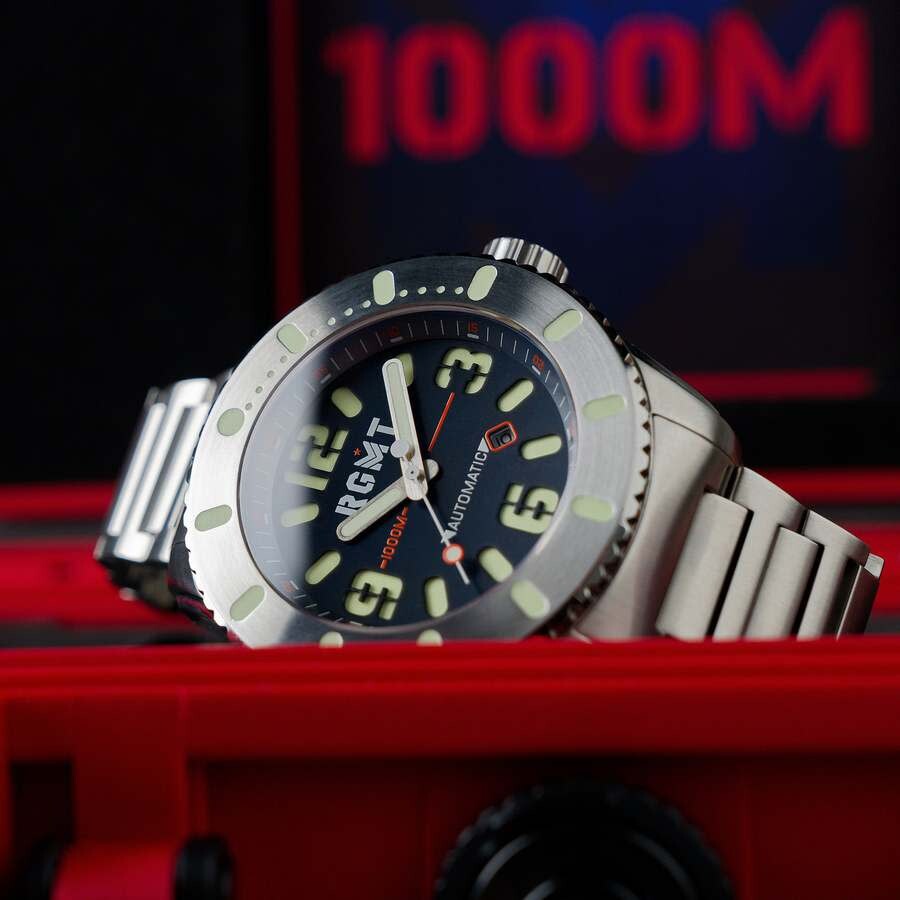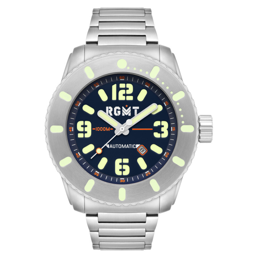 Time your adventures with the All-Brite Automatic collection. Featuring Miyota 8215 automatic movement and a stainless steel case with a 54mm diameter for an incredibly modern look, this watch is built to last, with 100 ATM water resistance and a scratch-resistant sapphire lens. Rose gold-tone stainless steel case with a silver-tone stainless steel bracelet. Fixed silver-tone stainless steel bezel. Silver-tone dial with silver-tone hands and Arabic numeral & index hour markers. Minute markers around the outer rim. Dial Type: Analog. Luminescent hands and markers. Date display between 4 and 5 o'clock position. Automatic movement. Scratch resistant sapphire crystal. Screw down crown. Solid case back. Round case shape, case size: 54 mm, case thickness: 18 mm. Band width: 26 mm, band length: 8 inches. Fold over clasp with a safety release. Water resistant at 1000 meters / 3300 feet. Functions: date, hour, minute, second. All Brite Series. Dive watch style. RGMT All Brite Automatic Silver Dial Men's Watch RG-8053-33.