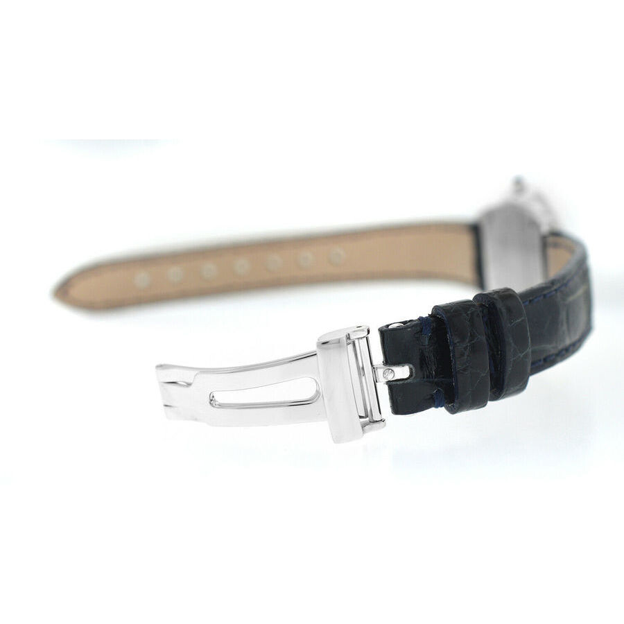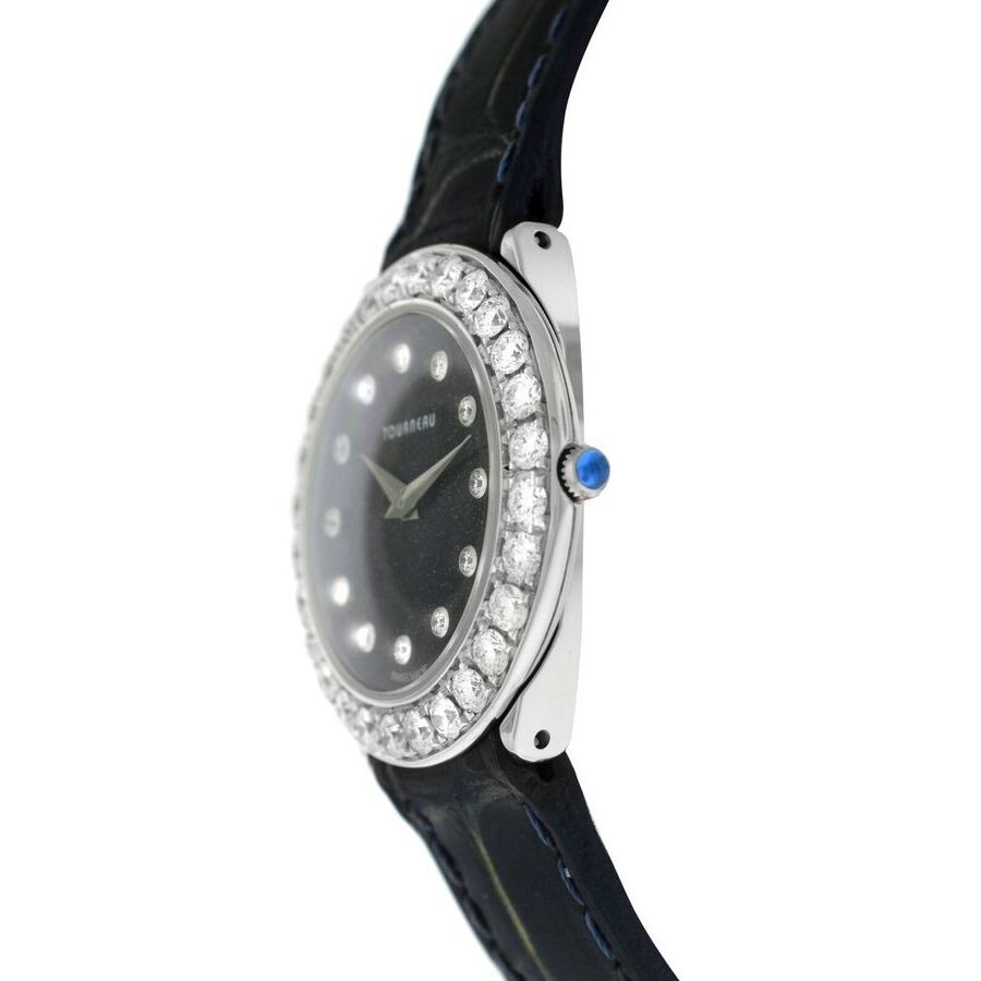 18kt white gold case with a black leather strap. Fixed 18kt white gold bezel. Black dial with silver-tone hands and diamond hour markers. Dial Type: Analog. Quartz movement. Cabochon crown. Solid case back. Round case shape, case size: 28 mm. Buckle clasp. Functions: hour, minute. Super Oro Round Series. Casual watch style. Watch label: Swiss Made. Pre-owned Tourneau Super Oro Round Quartz Diamond Black Dial Ladies Watch CA4138-BK.